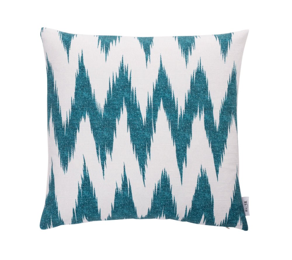 Precioso cojín fabricado en tela en color blanco y turquesa. Relleno de fibra incluido.