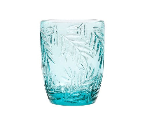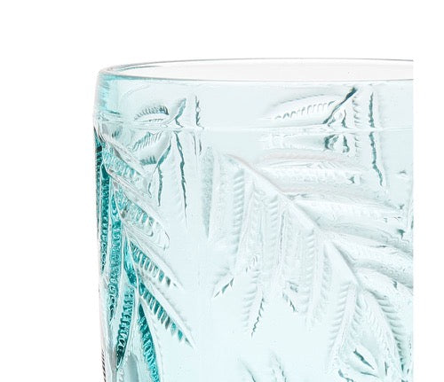 LIQUIDACIÓN - Set de 6 vasos de vidrio decorado con motivos de hojas de palmera en color turquesa.