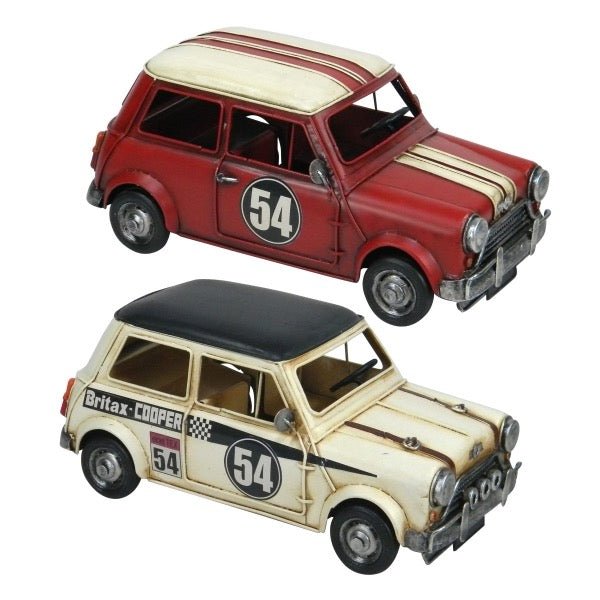 Preciosa figura de decoración en forma de coche fabricada en metal en color blanco o rojo.