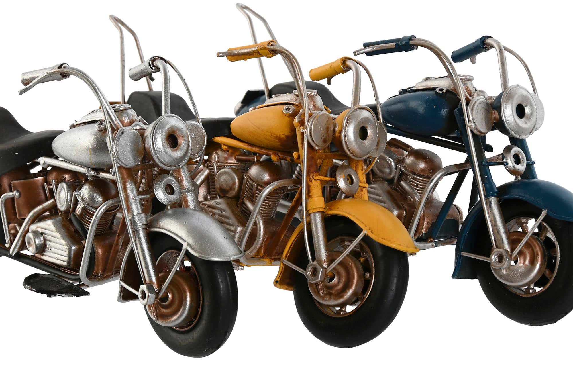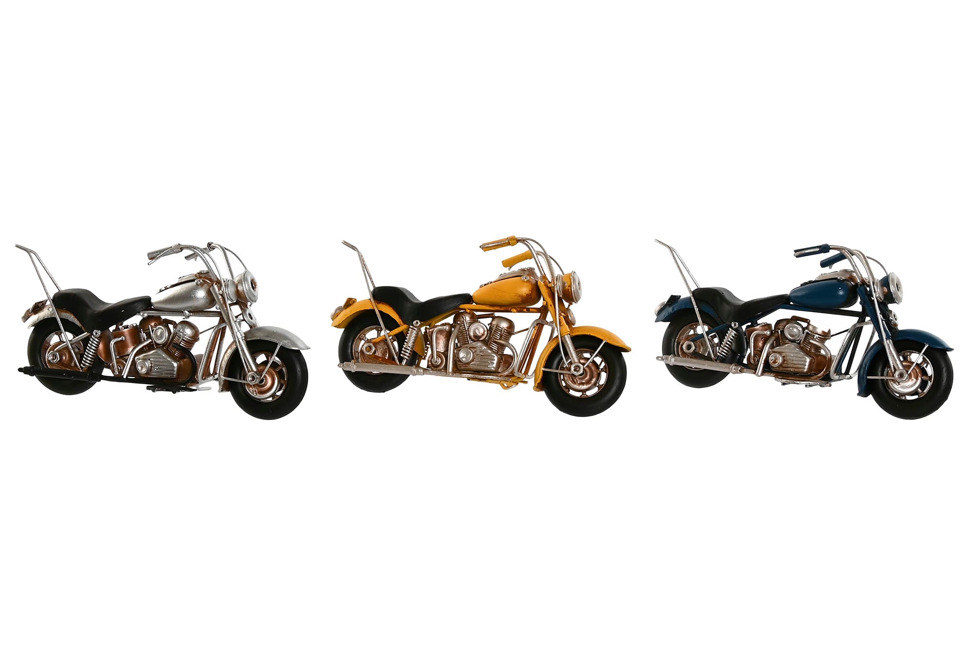 Preciosa figura de decoración en forma de motocicleta harley fabricada en metal en color amarillo, azul, plata.