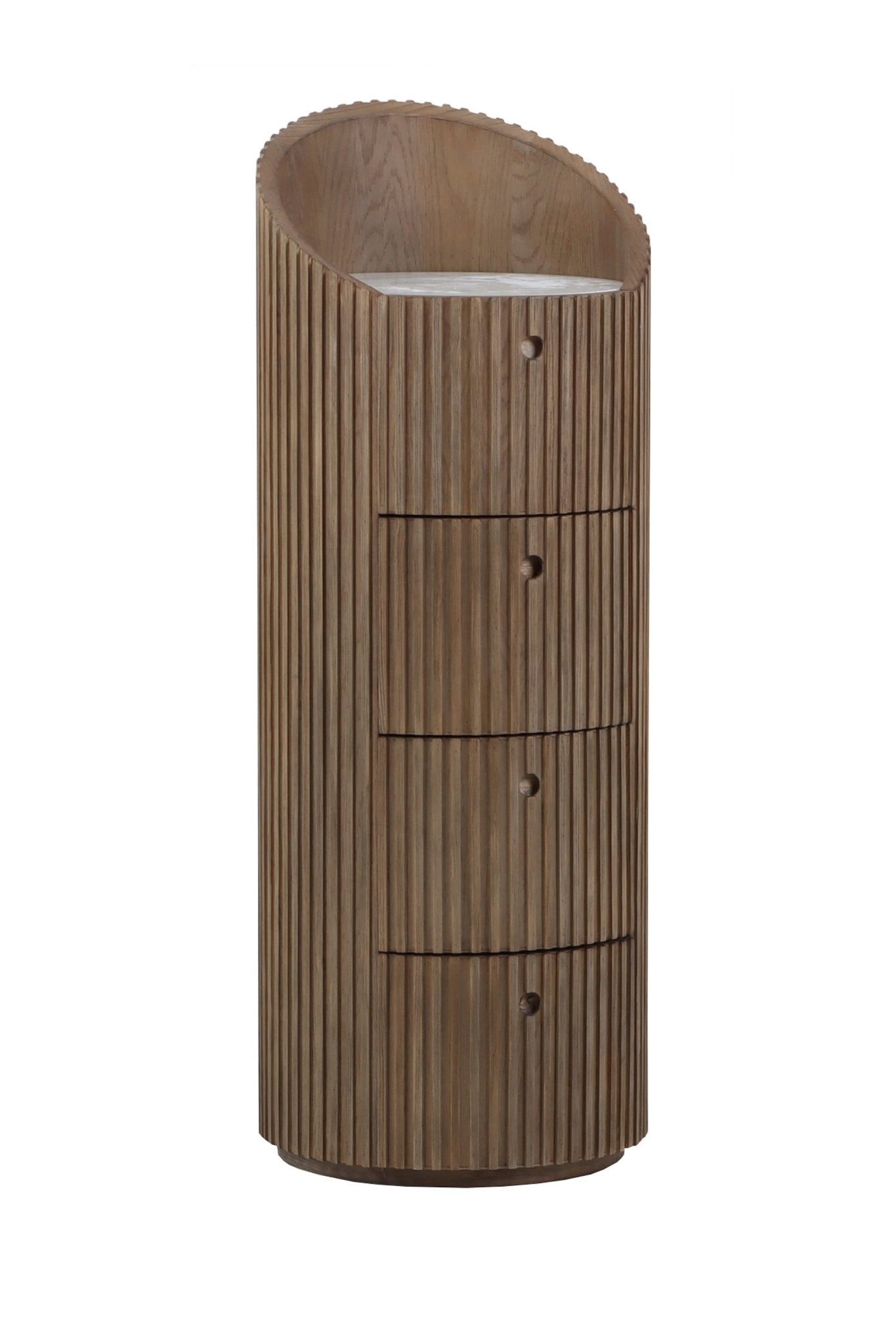 Precioso atril o cómoda de forma tubular con cuatro cajones fabricada en madera de roble color marrón con detalle en mármol blanco.