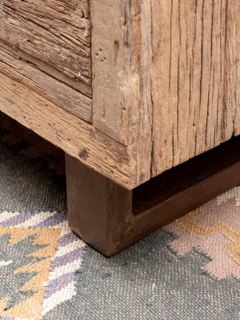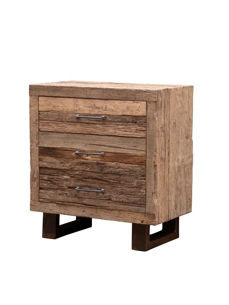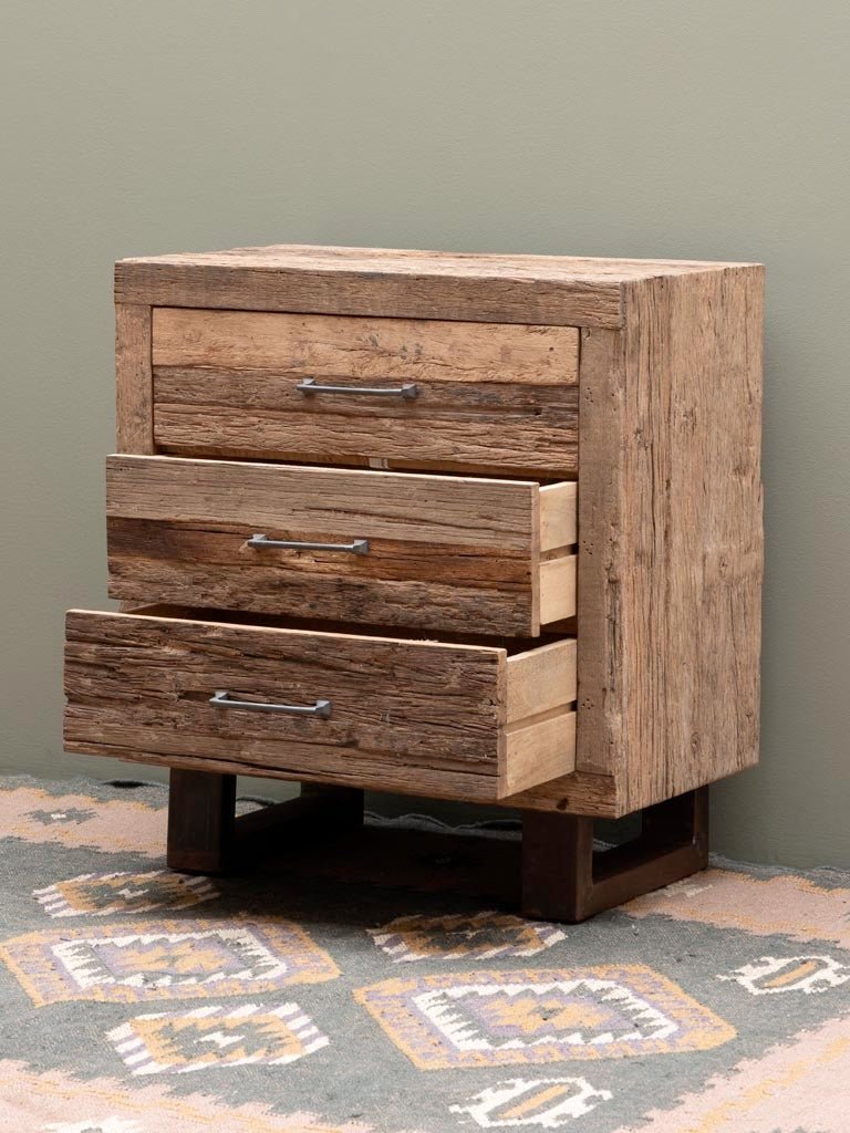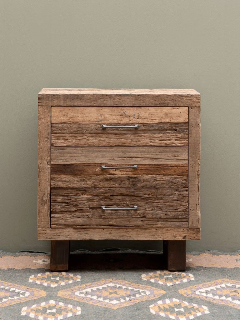Preciosa cómoda de 3 cajones fabricada en madera reciclada con patas y tiradores en hierro.