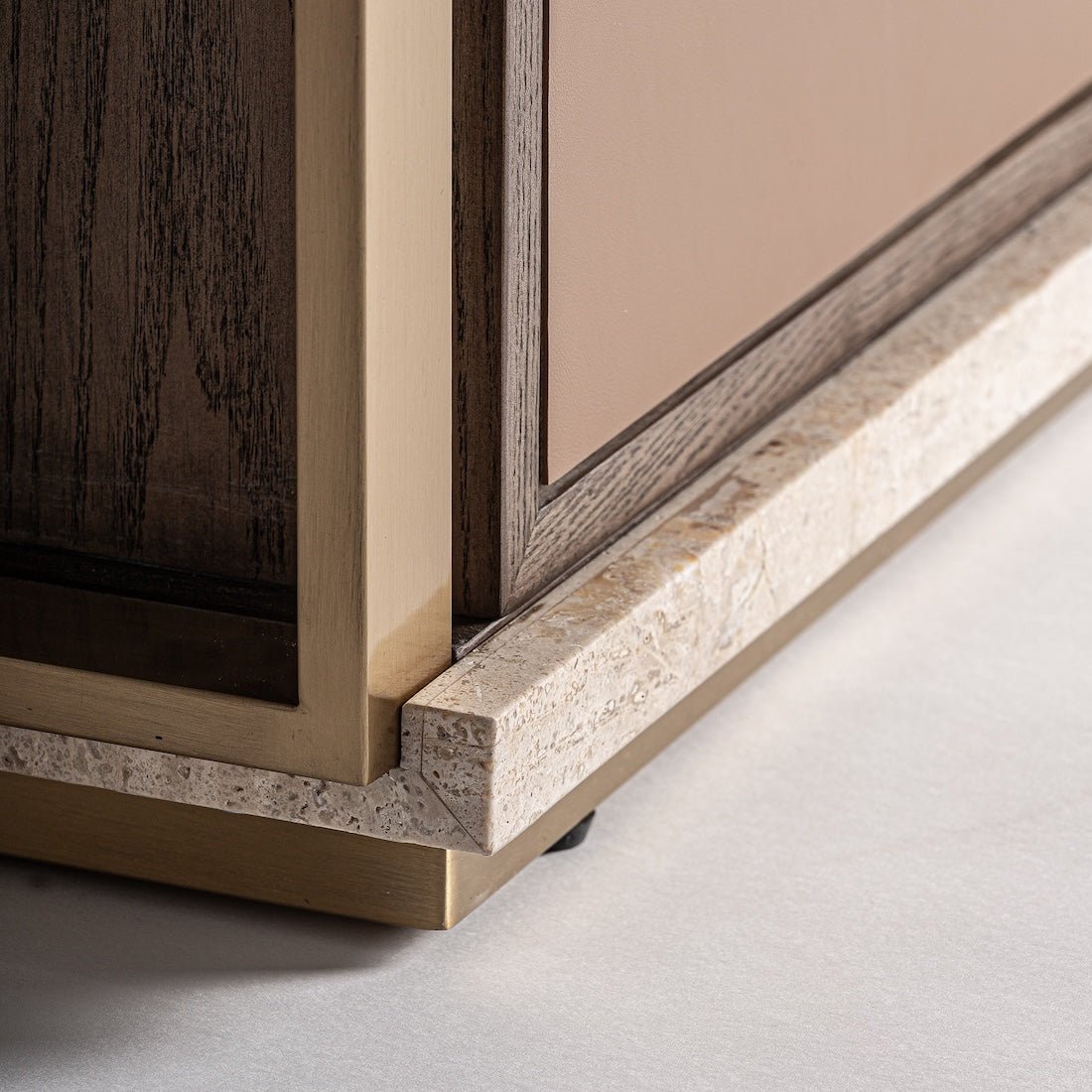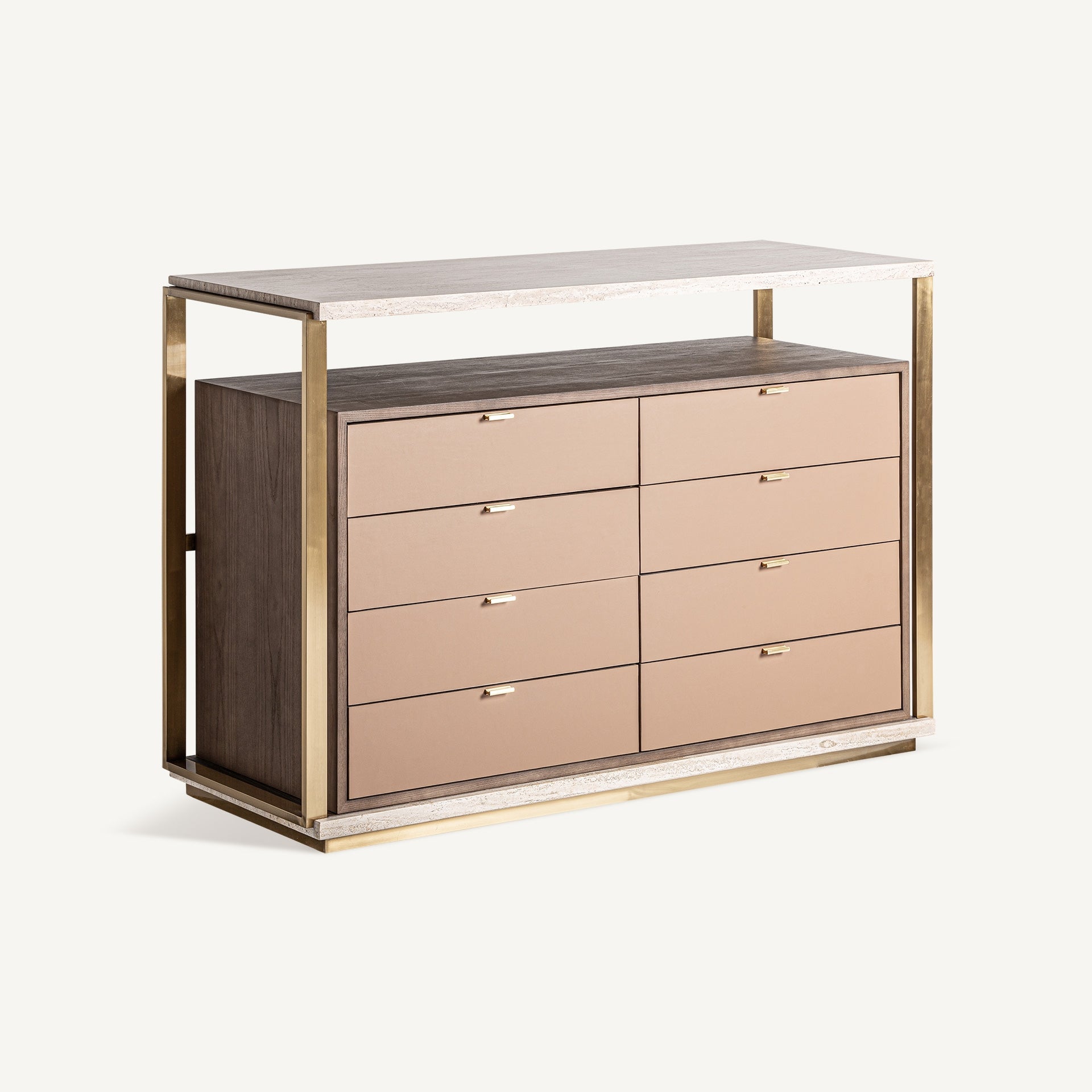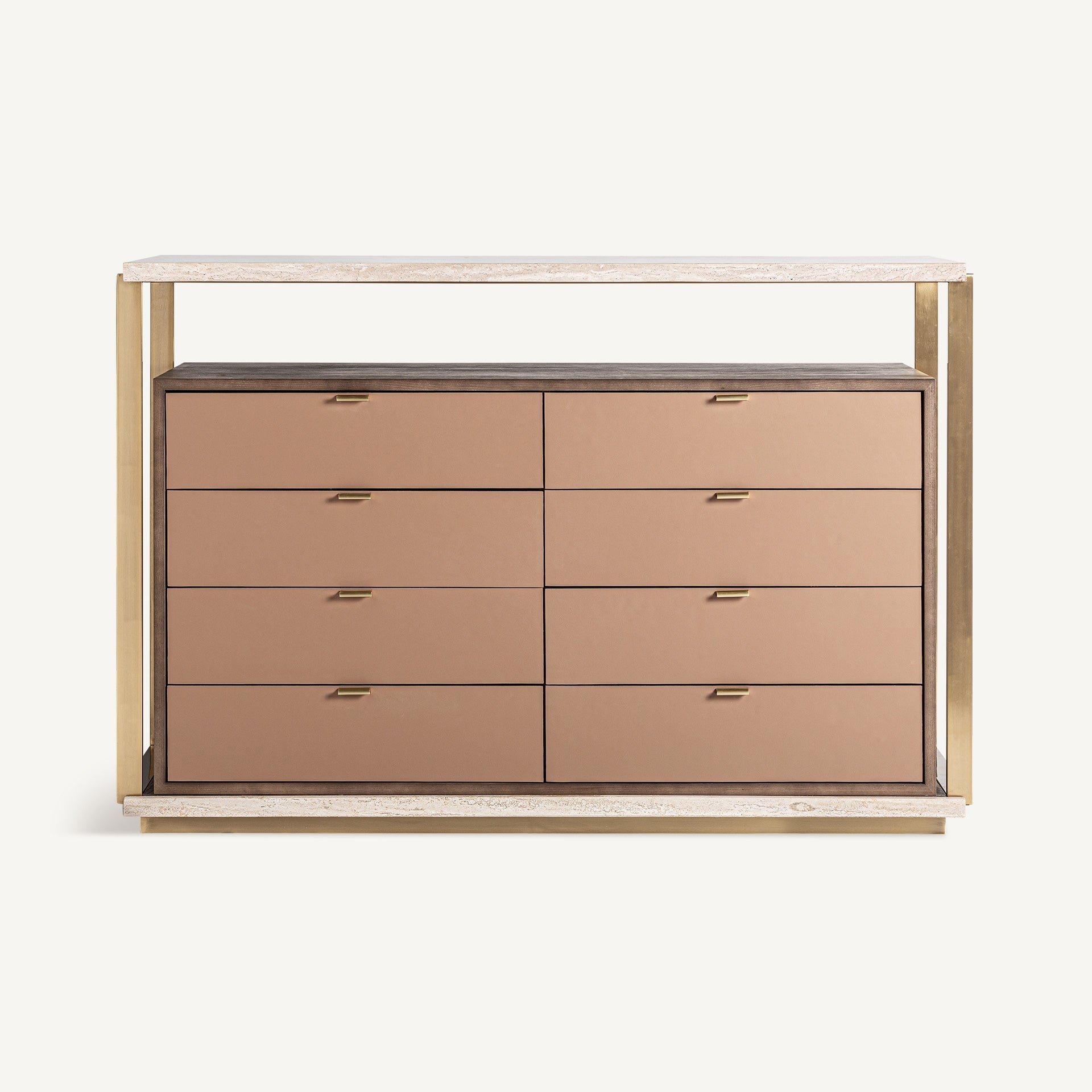 Cómoda de estilo art deco, fabricado en travertino en color beige, combinado con acero inoxidable en color dorado y madera dm en color marrón.