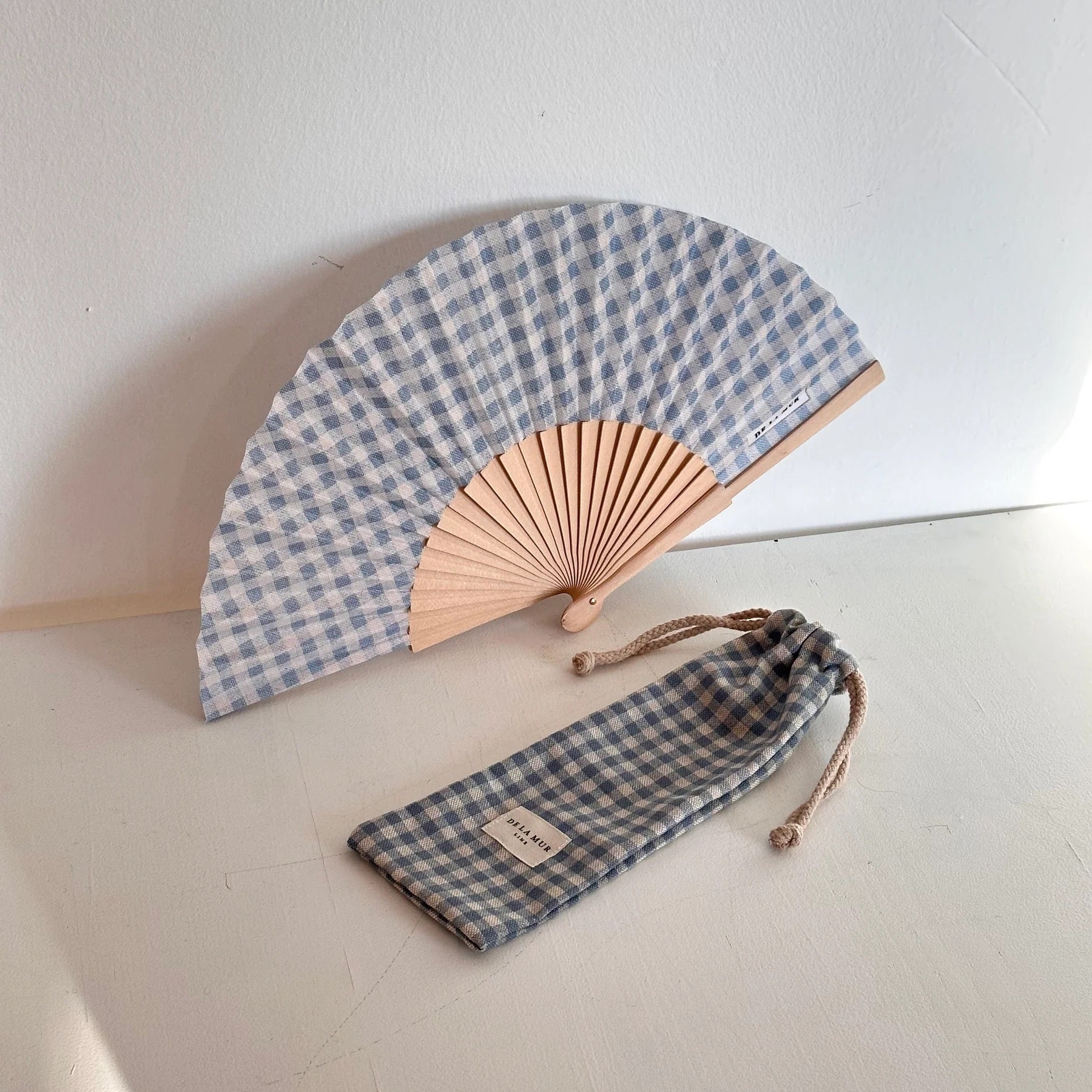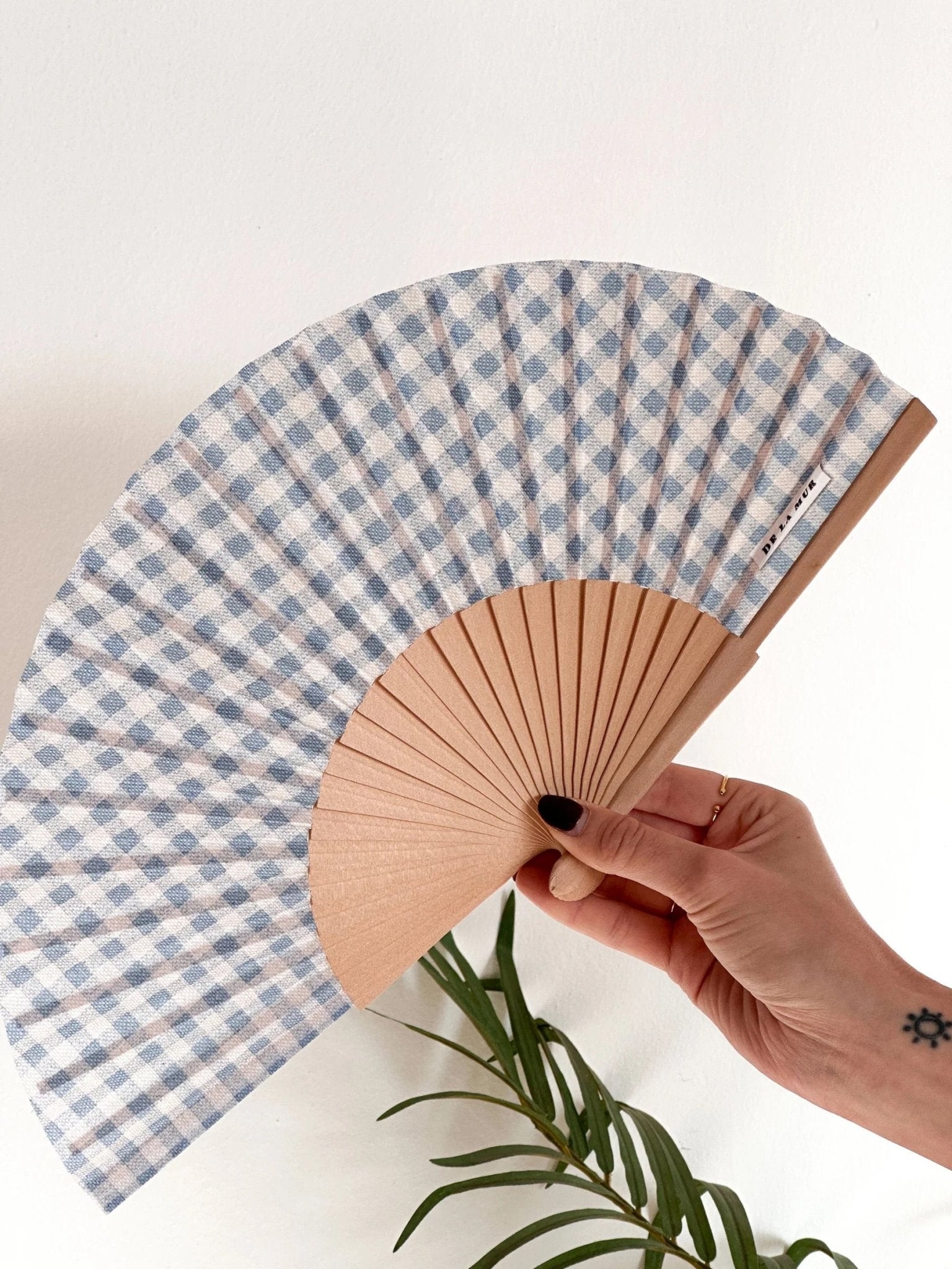 Abanico con funda a conjunto. Abanico con tela estampada 100% poliéster con tacto seda y madera natural pulida. Funda con tejido fino de half-panama con estampado a cuadros vichy en tono azul, con cordón ajustable en los laterales. Para su correcto mantenimiento se aconseja lavar la funda en frío y no utilizar secadora.