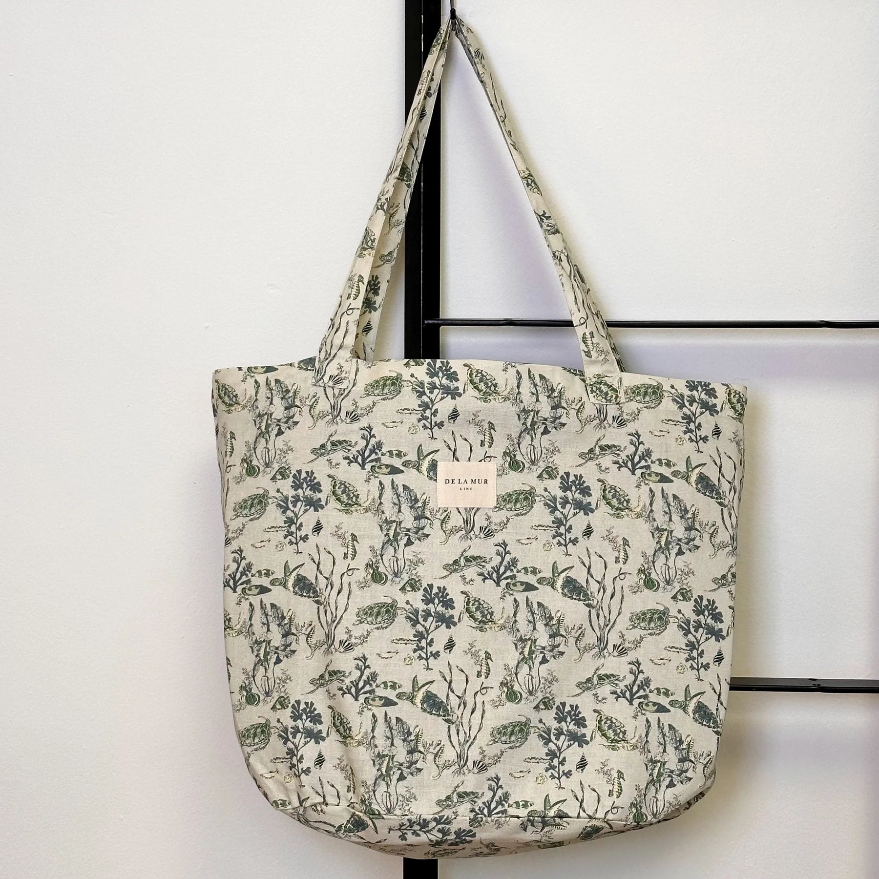 Bolsa shopper grande con asas para llevar al hombro. Con tejido con estampado marinero en tonos verdes y azules. Para su correcto mantenimiento se aconseja lavarlo en frío a mano y no utilizar secadora.