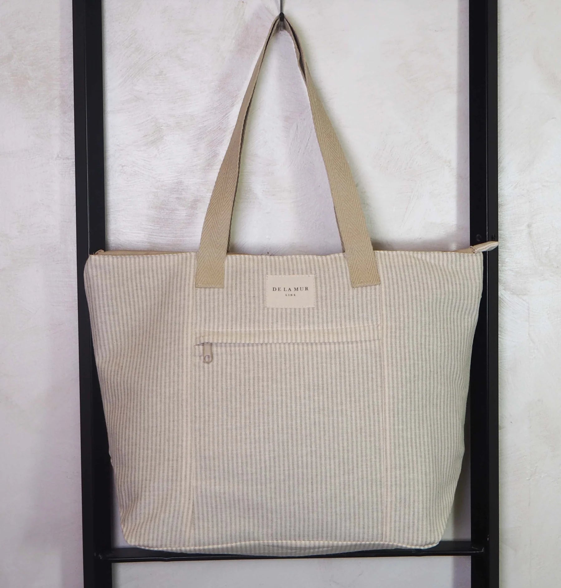 Bolso tipo “Shopper” con asas medianas en la parte superior. Con tejido con estampado a rayas de color blanco y beige. Bolsillos interior y exterior con cremallera. Asa de cinta de espiga de algodón de color beige. Para su correcto mantenimiento se aconseja lavarlo en frío y no utilizar secadora.