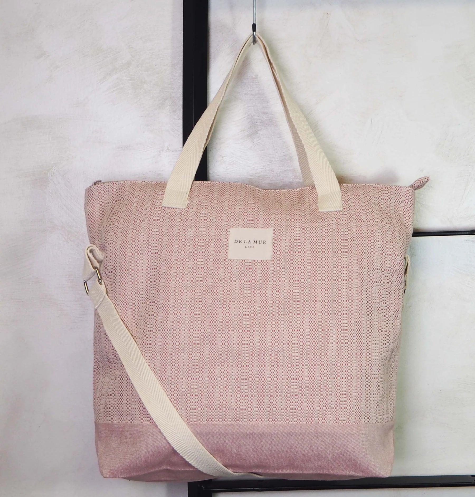 Bolso grande con asa larga ajustable y dos asas medianas en la parte superior. Combinado con dos tejidos diferentes, un tejido con muestra en tono rosa claro en la parte superior y un tejido liso rosa claro en la parte inferior. Opción de llevarlo al hombro o como bandolera. Bolsillo interior con cremallera. Asas de cinta de espiga de algodón de color crudo. Para su correcto mantenimiento se aconseja lavarlo en frío y no utilizar secadora.