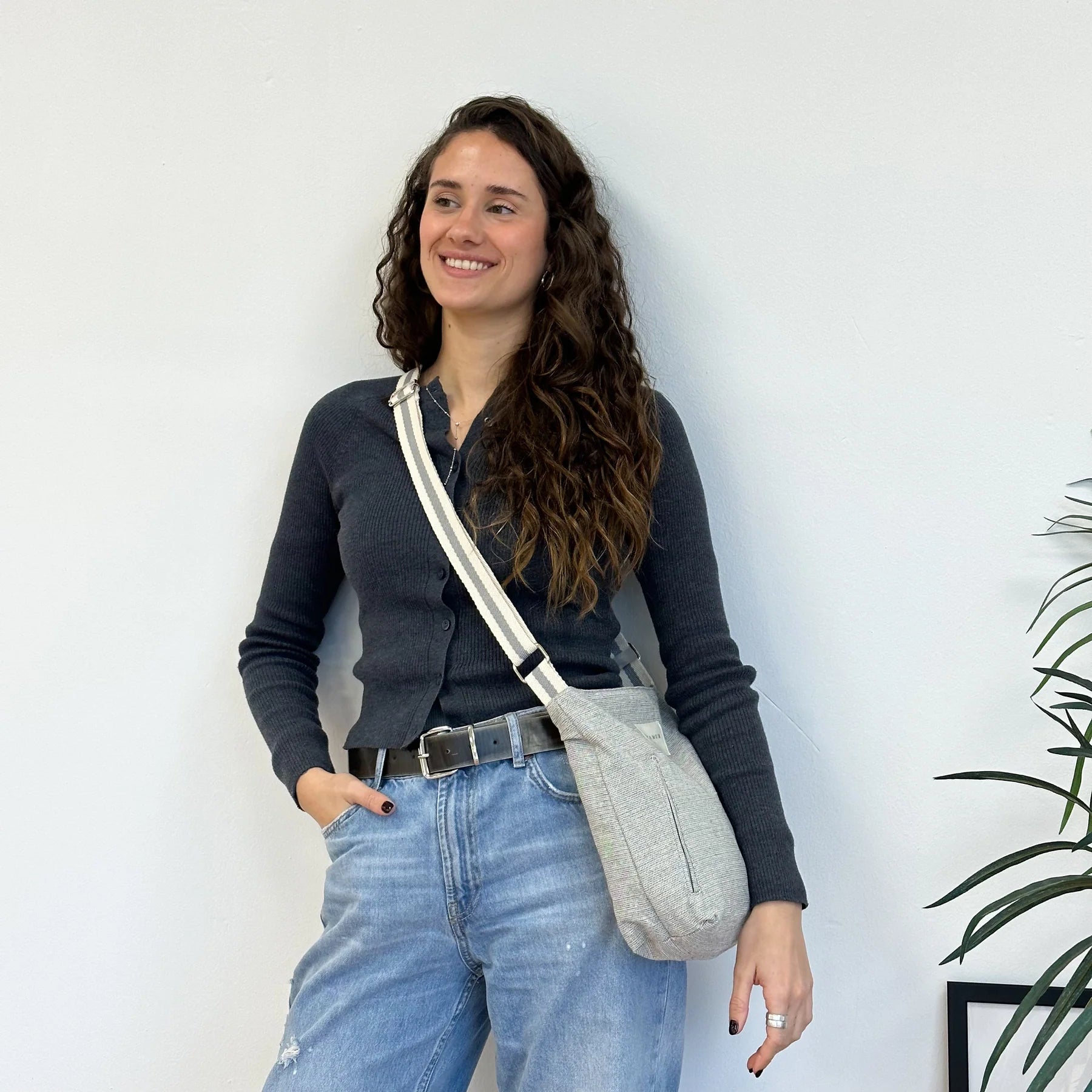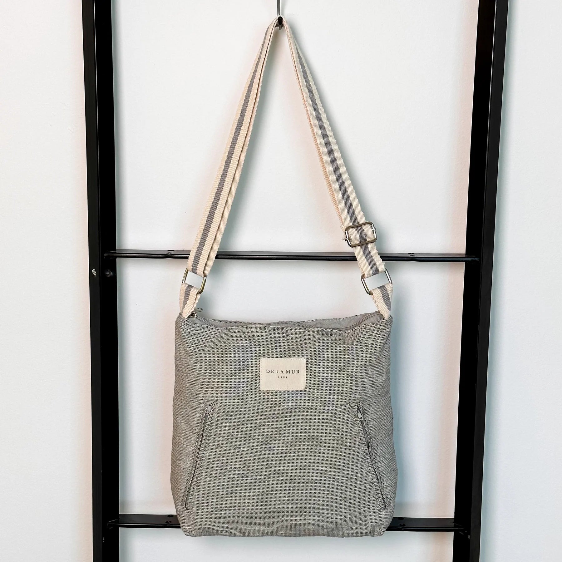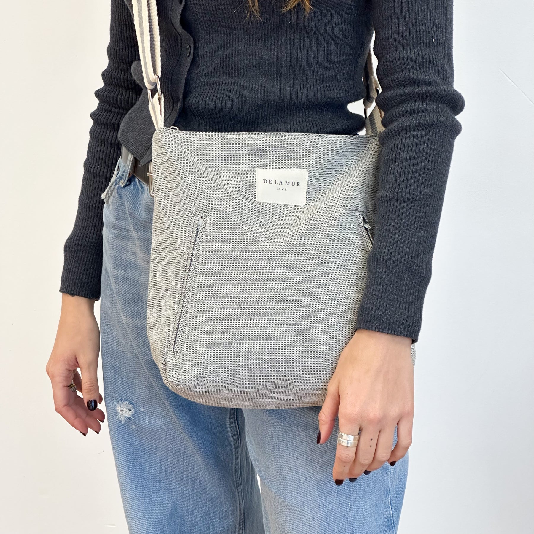 Bolso mediano tipo bandolera con asa larga ajustable de cinta de espiga de algodón de color crudo con raya gris en el centro. Con un tejido fino liso de color gris claro. Cierre superior con cremallera. Dos bolsillos en la parte frontal con cremallera. Forrado de tejido grueso de color gris en la parte interior. Bolsillo interior con cremallera. Para su correcto mantenimiento se aconseja lavarlo en frío a mano y no utilizar secadora.