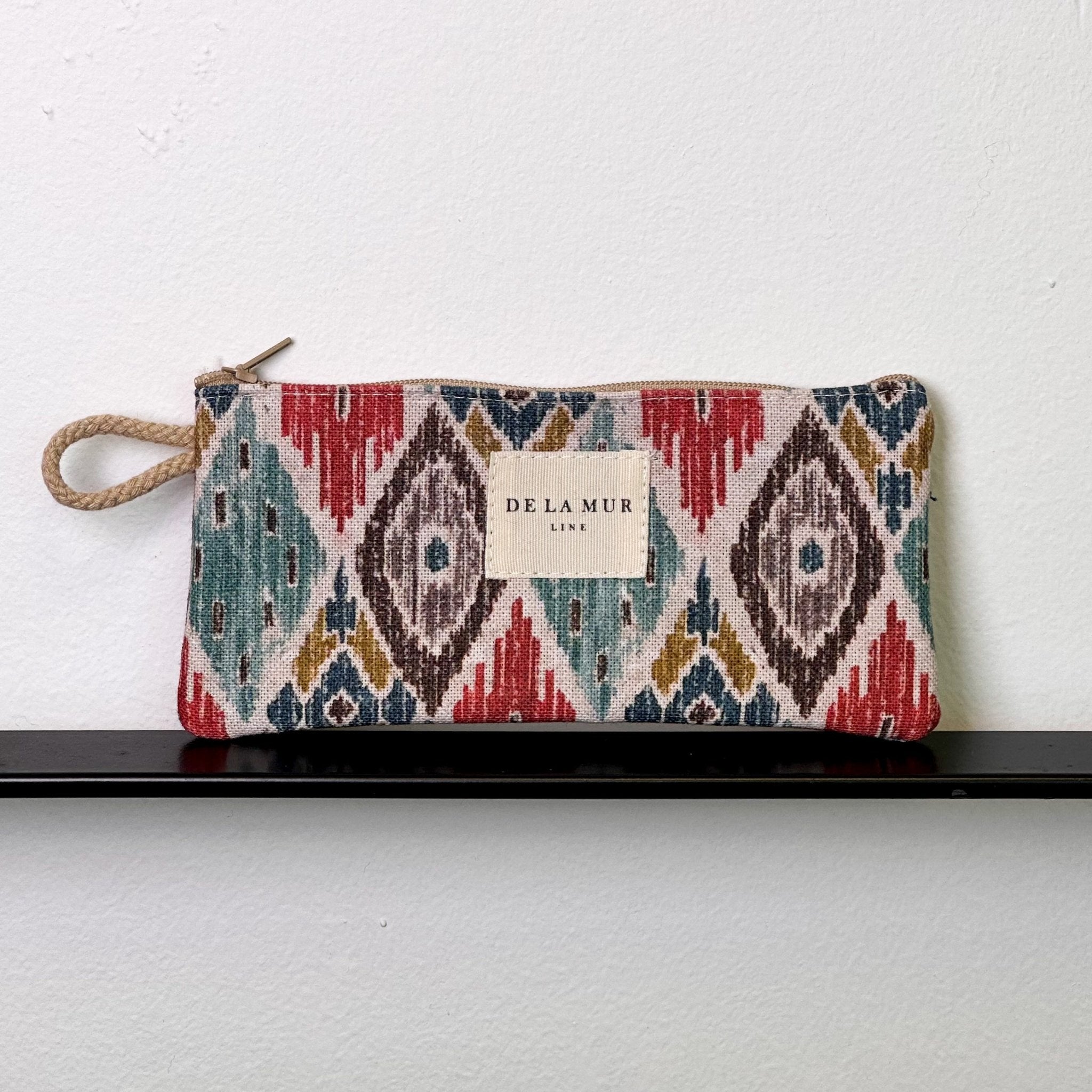 Funda de gafas con cremallera en la parte superior y pequeña asa de cordón de color beige en el lateral. Con tejido con estampado geométrico multicolor. Cada articulo puede tener una variación en el estampado, dependiendo de donde se haya efectuado el corte de la pieza. Forrado de tejido grueso de color gris en la parte interior. Para su correcto mantenimiento se aconseja lavarlo en frío a mano y no utilizar secadora.