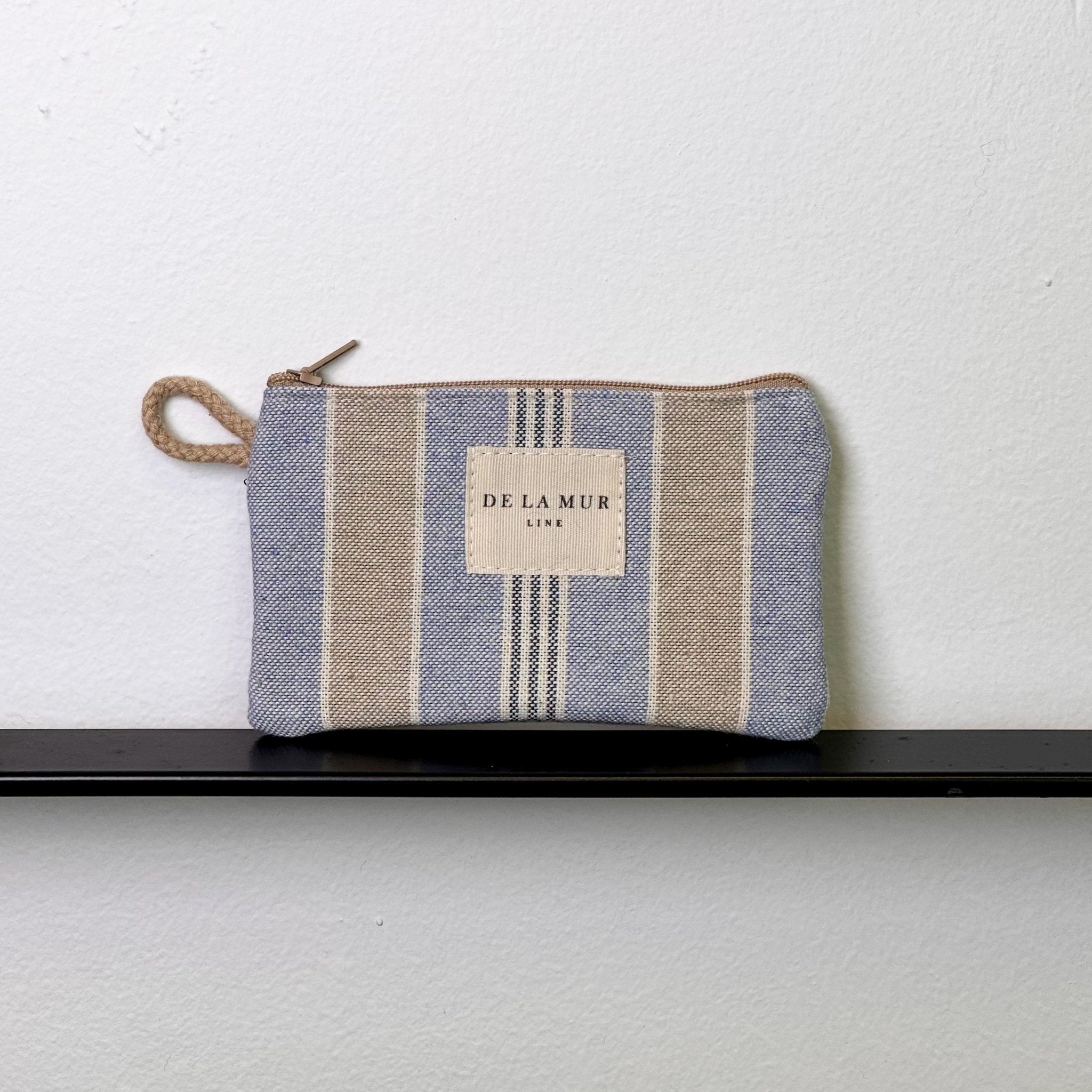 Monedero con cremallera en la parte superior y pequeña asa de cordón de color beige en el lateral. Con tejido con estampado a rayas azules y marfil. Cada articulo puede tener una variación en el estampado, dependiendo de donde se haya efectuado el corte de la pieza. Forrado de tejido grueso de color gris en la parte interior. Para su correcto mantenimiento se aconseja lavarlo en frío a mano y no utilizar secadora.