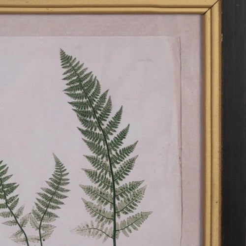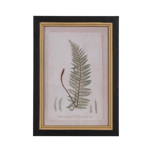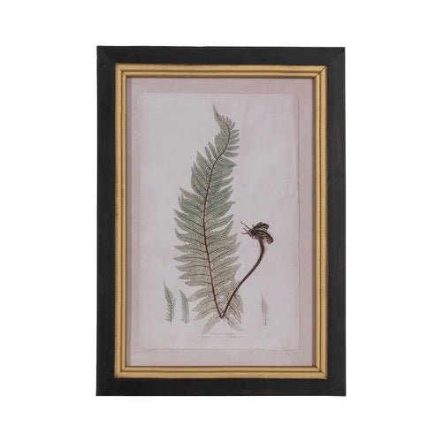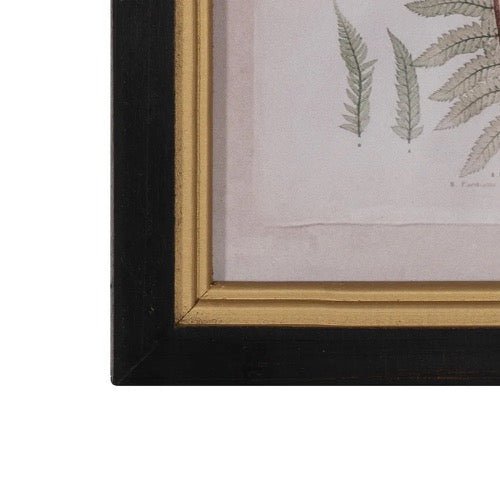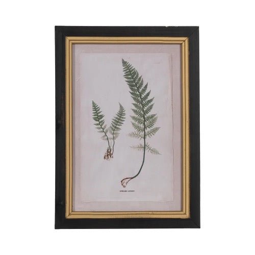 Precio por unidad. Cuadro decorativo con impresión de helechos, disponible en cuatro modelos diferentes. Realizado con marco de madera de abeto, papel, cristal y DM, incorpora gancho para facilitar su colocación. Una pieza de inspiración botánica que aporta frescura, naturalidad y un estilo atemporal a cualquier estancia.