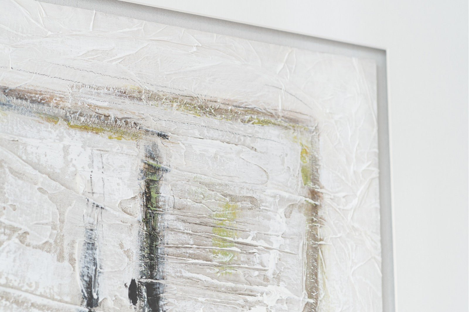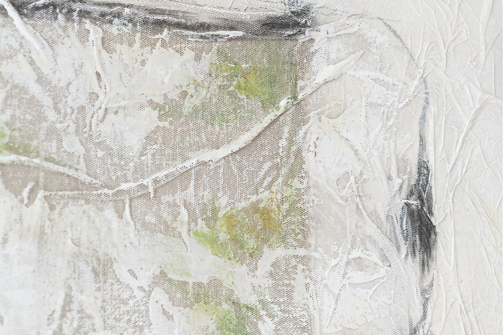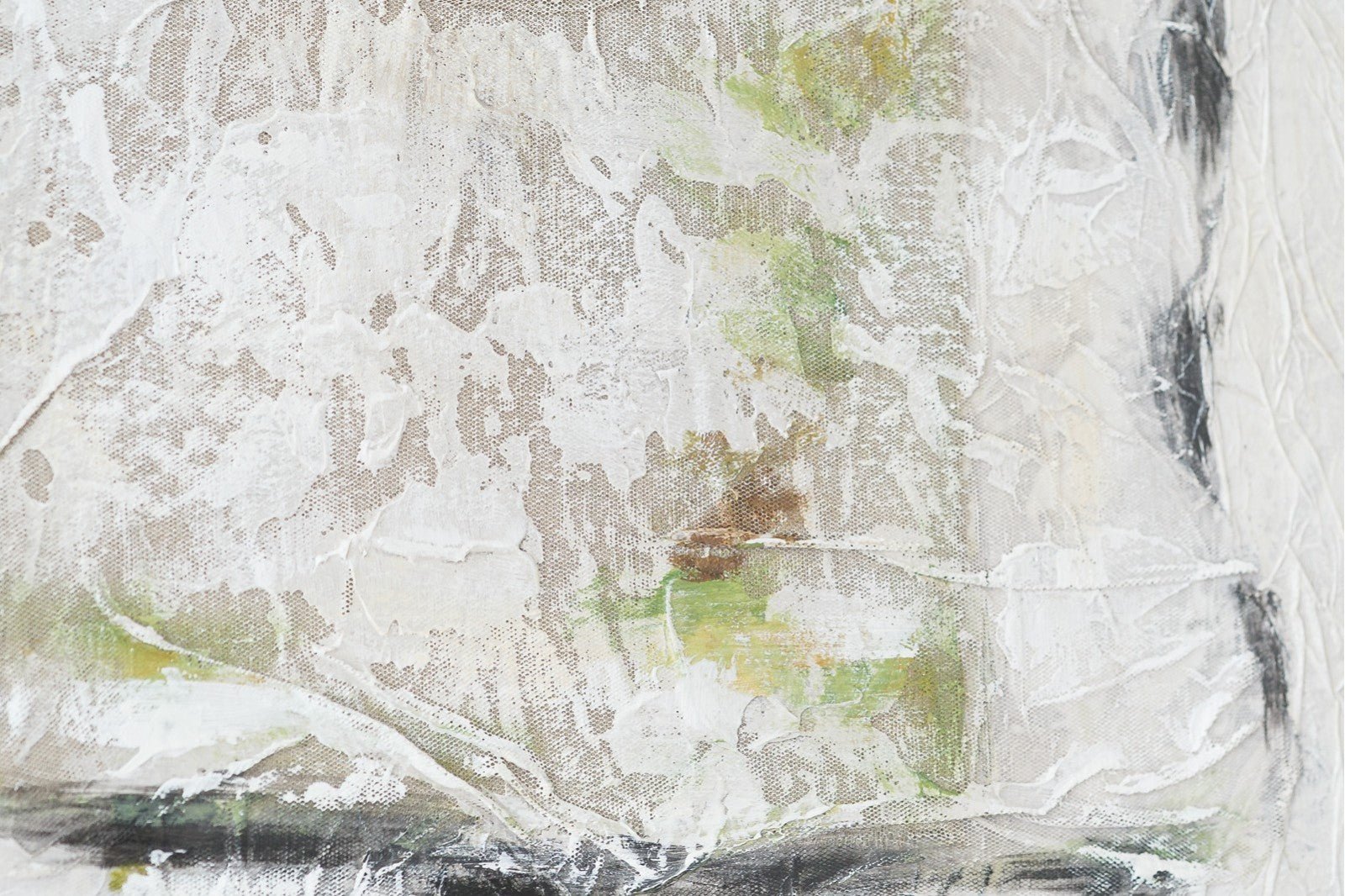 El cuadro Abstracción en Lino Verdi es una obra realizada a mano que destaca por su originalidad y riqueza de texturas. El motivo central en lino se combina con la aplicación de tonos blancos, beige, grises y pinceladas en verde lima, creando una composición llena de profundidad, movimiento y modernidad.