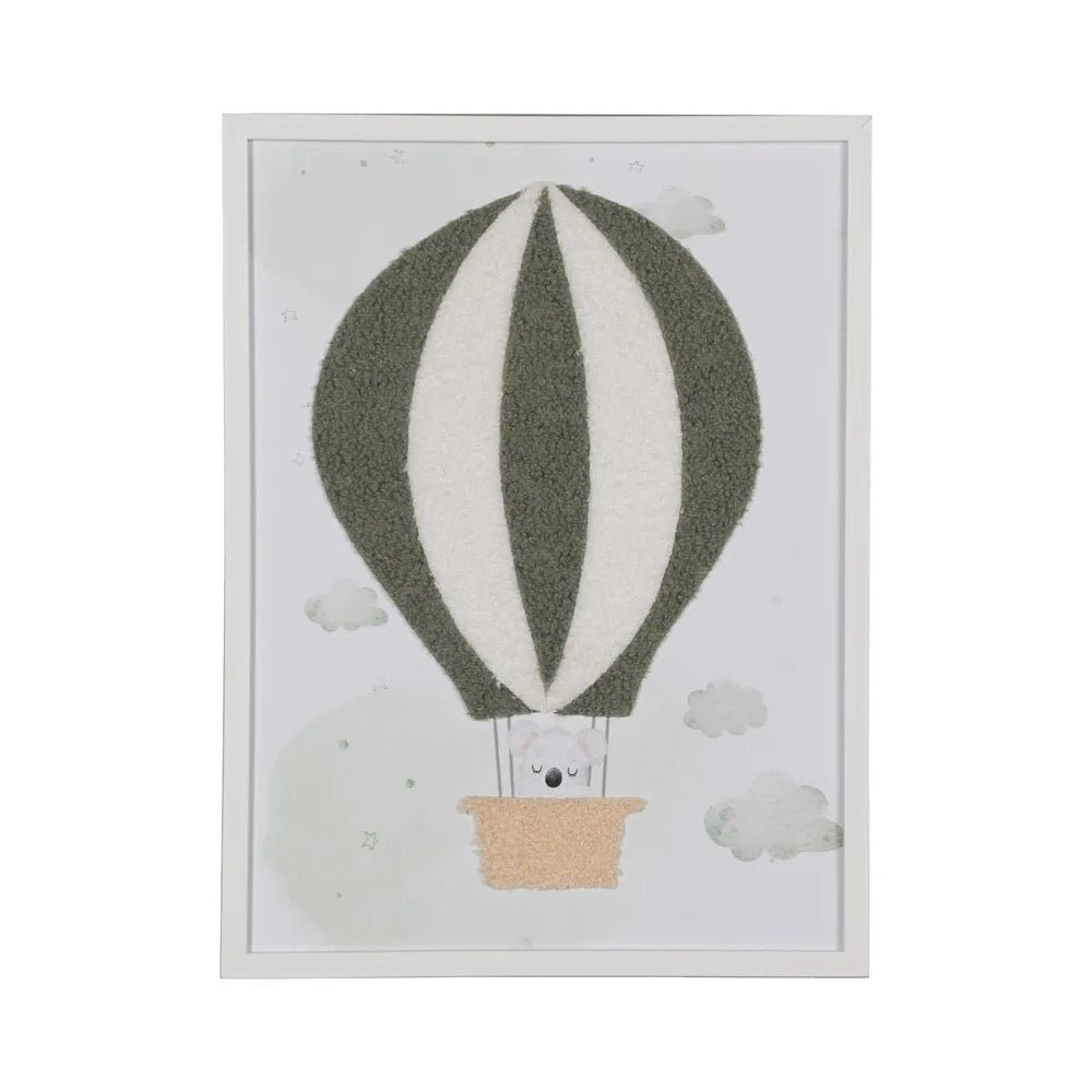 Preciosos cuadros infantiles de impresión con dibujos de globos amarillo y verde con marco de poliestireno en color blanco. Disponible dos modelos diferentes.