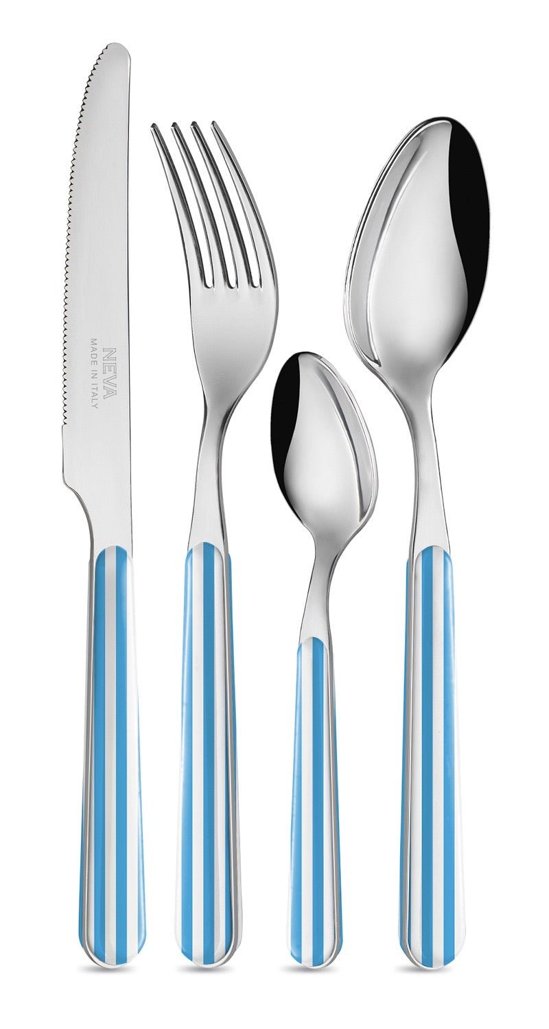 Descubre esta maravillosa cubertería de la firma italiana Neva fabricada en acero inoxidable con mango a rayas de color azul celeste y blanco.