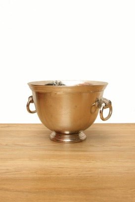 Preciosa cubitera con dos asas fabricada en aluminio color plateado.