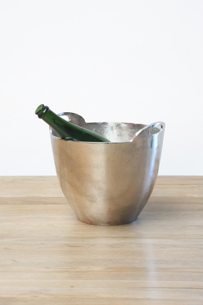 Preciosa cubitera redonda con dos asas fabricada en aluminio color plateado.