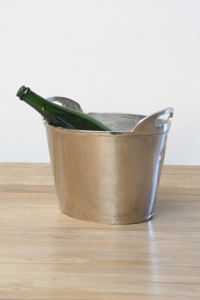 Preciosa cubitera ovalada con dos asas fabricada en aluminio color plateado.