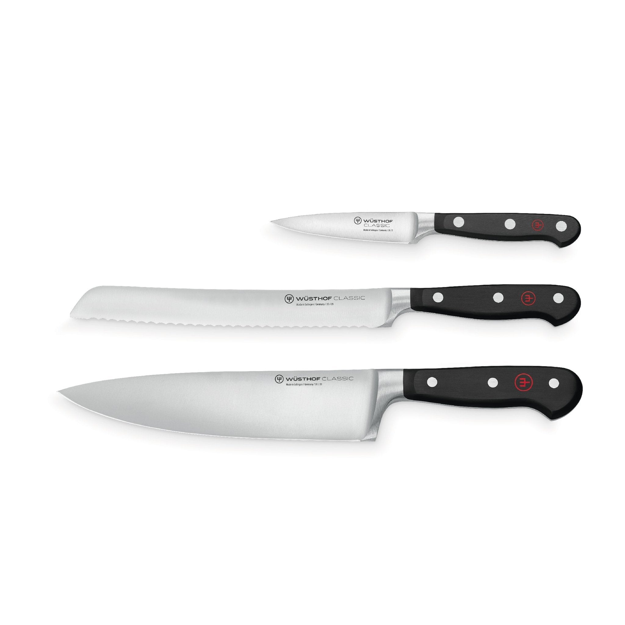 El Juego de cuchillos Wüsthof Classic de 3 piezas es un juego de cuchillos pequeño pero práctico. El juego contiene un cuchillo de chef para todas las tareas grandes en la cocina. Con el cuchillo para pan podrás cortar fácilmente bollos grandes y pequeños, y con el cuchillo puntilla podrás realizar todas las demás tareas pequeñas en la cocina. Este juego no contiene un bloque de cuchillos.