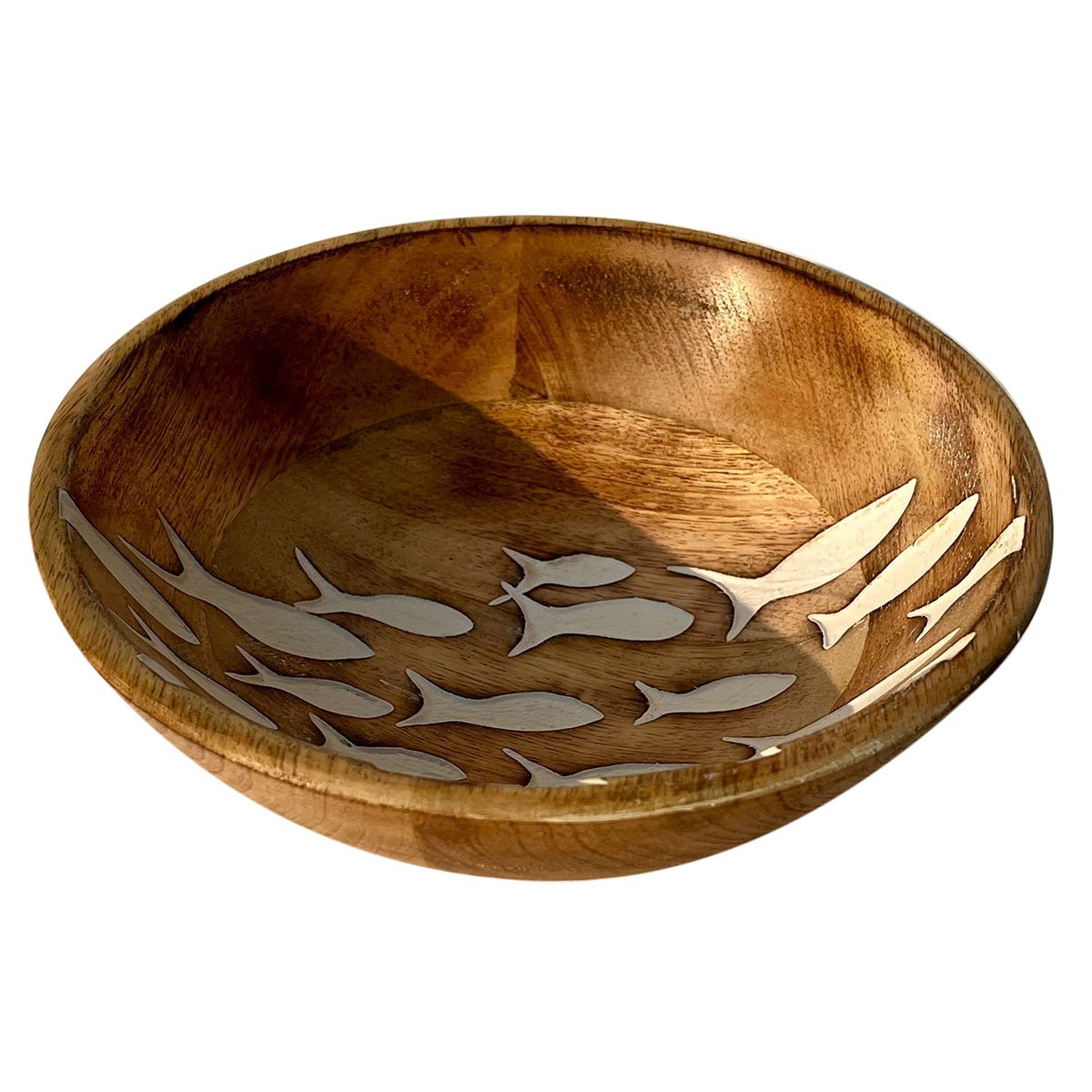 Bowl fabricado en madera natural con dibujos de peces en color blanco.