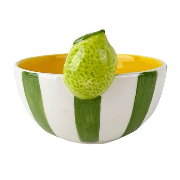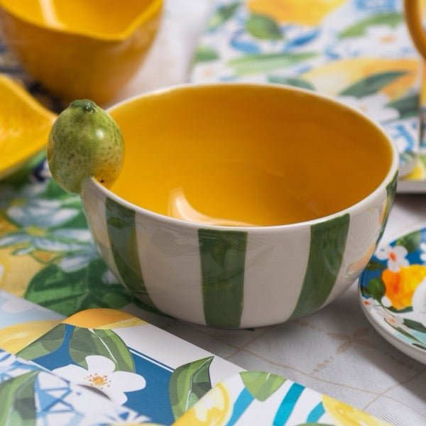 Cuenco en forma de limón, elaborado en cerámica y decorado con alegres tonos blanco, verde y amarillo que aportan frescura y vitalidad a la mesa. Una pieza original y versátil, perfecta para servir aperitivos, frutas o como detalle decorativo que evoca el encanto mediterráneo.