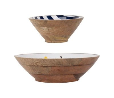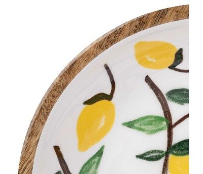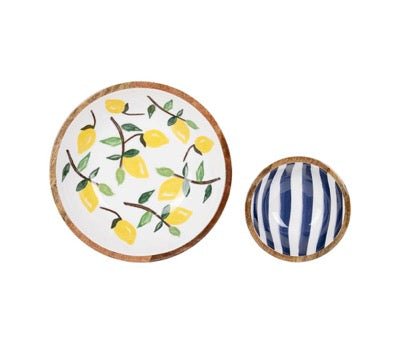 Estos encantadores cuencos artesanales combinan funcionalidad y diseño con un toque fresco y veraniego. Fabricados en madera de mango natural, cada pieza destaca por su calidez y durabilidad. El cuenco grande presenta un alegre estampado de limones que evoca tardes soleadas y sabores cítricos, mientras que el cuenco pequeño luce elegantes rayas en azul marino, inspiradas en las olas del Mediterráneo. Perfectos para servir aperitivos, frutas, snacks o simplemente decorar tu mesa con estilo. Su diseño pintado a mano los convierte en piezas únicas que aportan un aire fresco y natural a cualquier espacio.