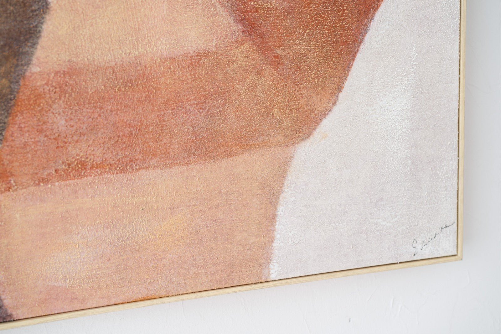 El conjunto se completa con un marco en acabado natural, que aporta calidez y resalta la riqueza de los colores y la composición, convirtiéndolo en un elemento decorativo sofisticado y versátil, perfecto para salones, estudios o espacios contemporáneos.