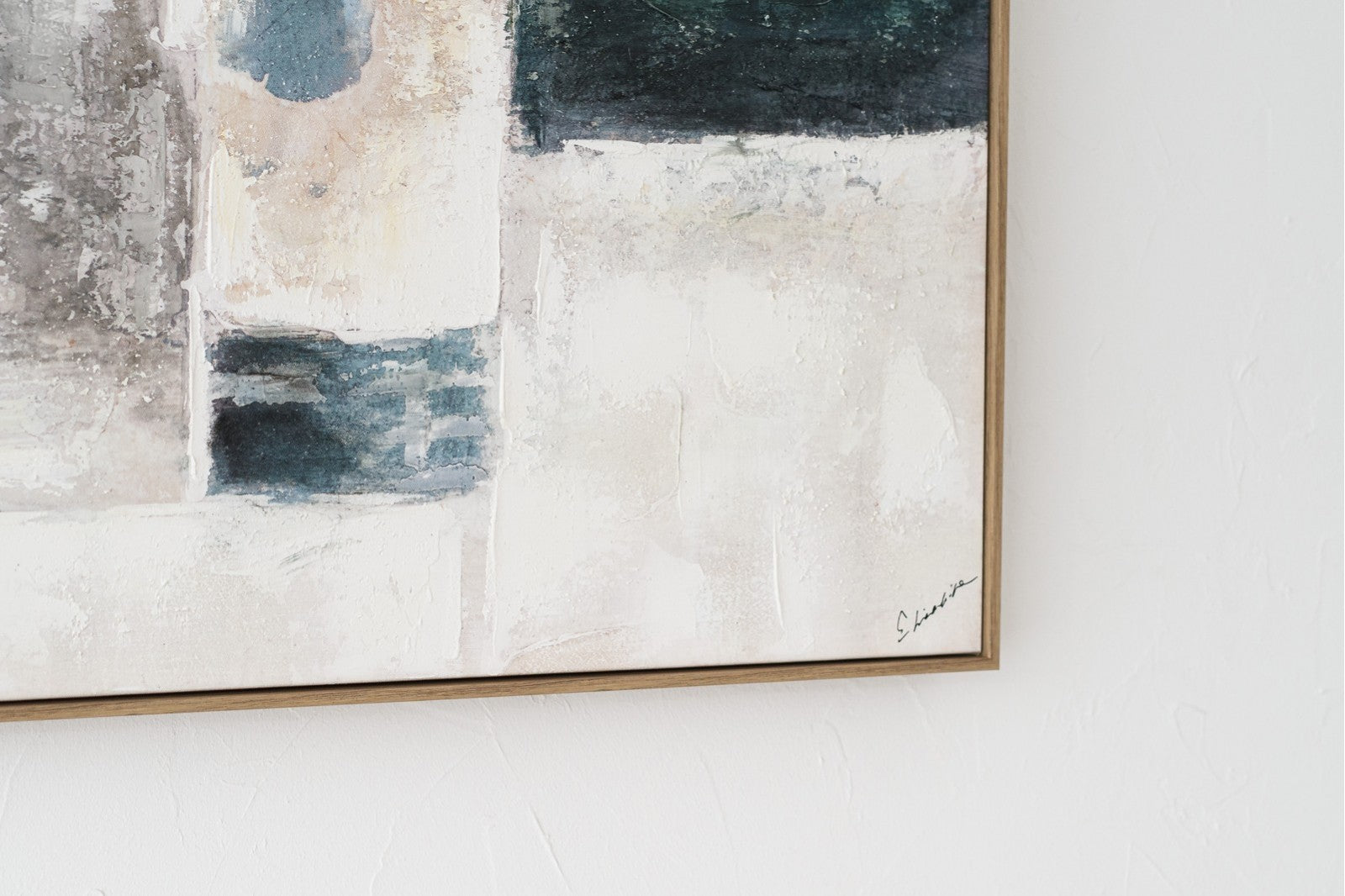 El marco en tono natural realza los matices del lienzo, convirtiendo la obra en un elemento decorativo sofisticado y versátil, ideal para aportar personalidad y estilo a salones, estudios, dormitorios o cualquier espacio que busque un toque de arte contemporáneo.