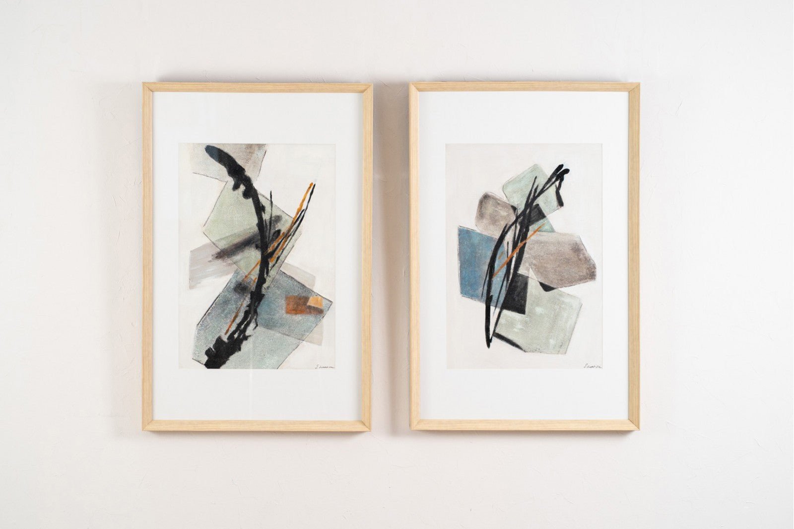 Cuadro abstracto realizado a mano sobre lienzo con una composición en cubos usando tonos grises, verdes, azules y un toque de naranja oscuro, enmarcada en cristal y con marco en color madera natural.
