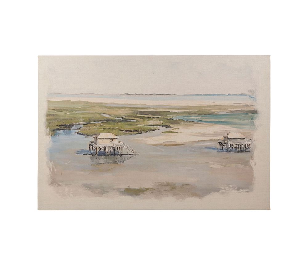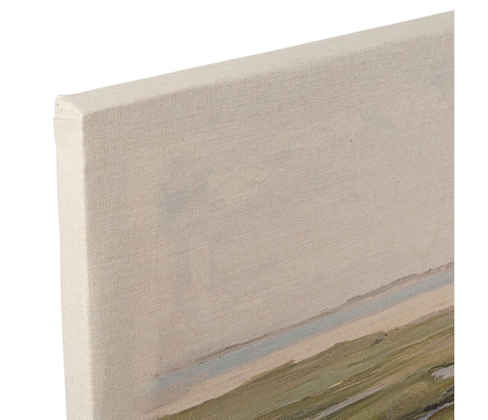 Cuadro decorativo fabricado en lino y madera, que representa un sereno paisaje costero. En primer plano, la playa arenosa se adorna con vegetación de dunas y arbustos, mientras que el mar se extiende bajo un cielo parcialmente nublado en tonos azules y blancos. En el horizonte se distinguen suaves formaciones terrestres que completan la escena. La paleta cromática, dominada por azules, verdes y matices tierra, aporta frescura y equilibrio, convirtiendo esta pieza en un elemento perfecto para transmitir calma y armonía en cualquier espacio del hogar.