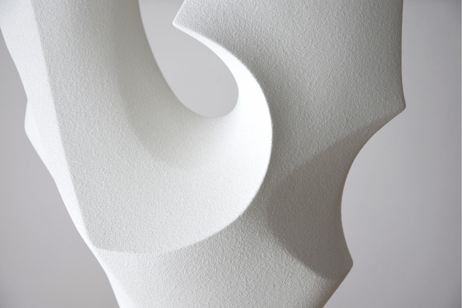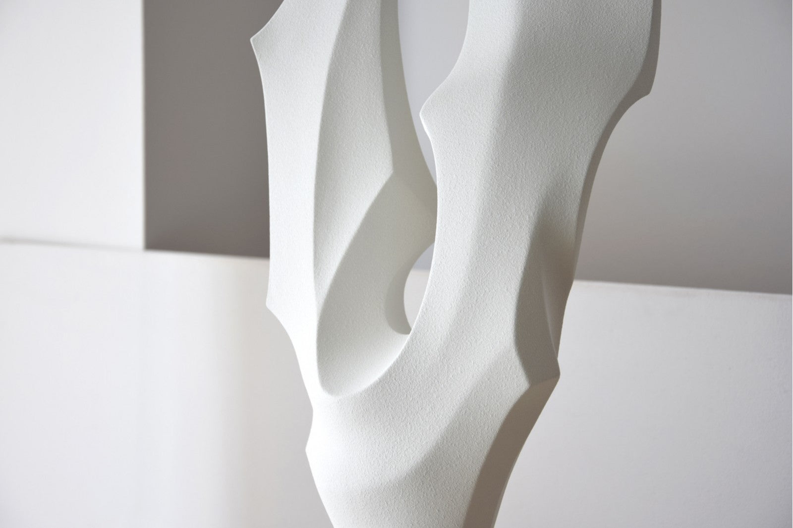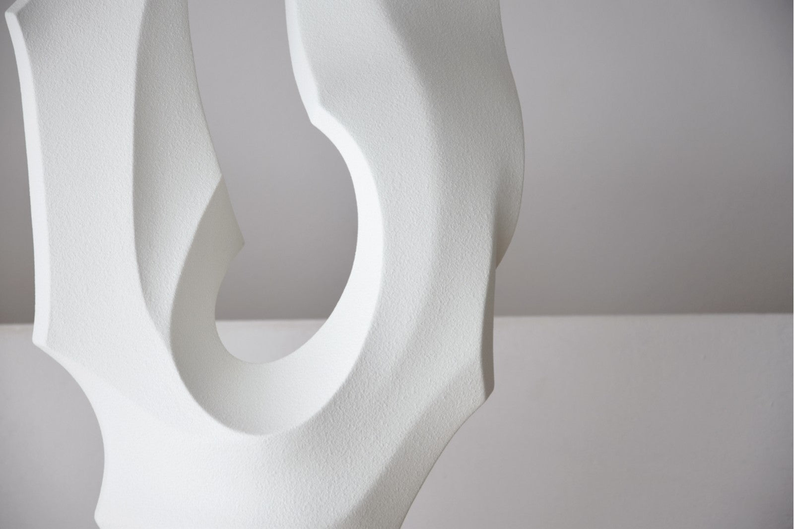 Original escultura realizada en cerámica color blanco roto y acabado con una sutil textura rugosa mate. La parte principal se apoya sobre un cilindro cerámico a través de un delgado perfil metálico en negro, realizada de forma artesanal se cuece a alta temperatura.