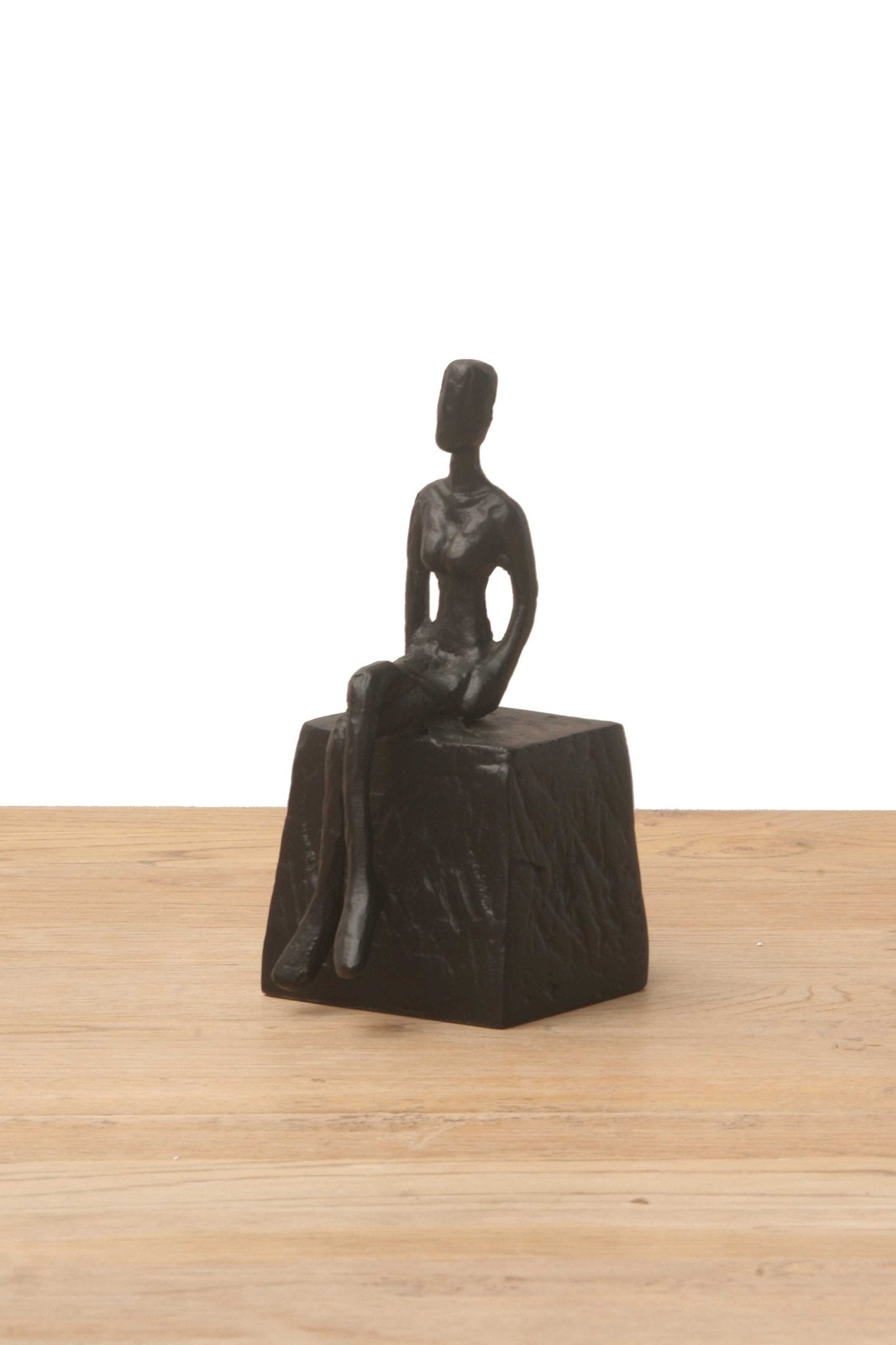 Preciosa figura decorativa de hombre sentado fabricado en aluminio y estaño en color negro.