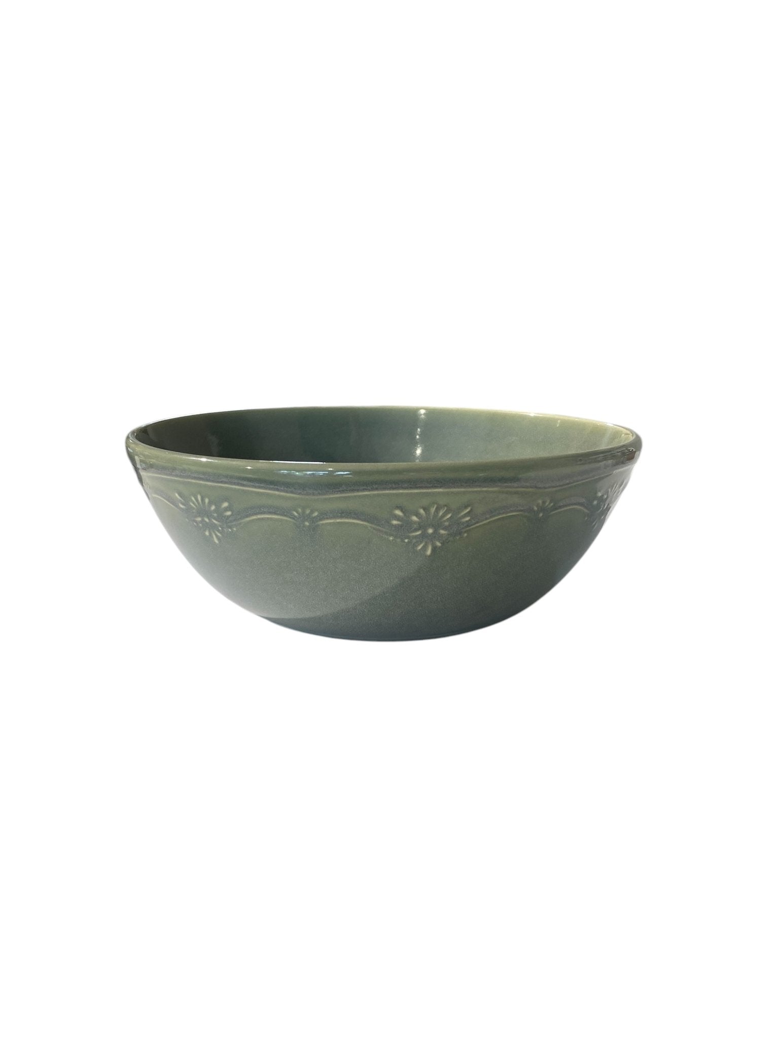 Preciosa ensaladera fabricada en gres de color verde con flores.
