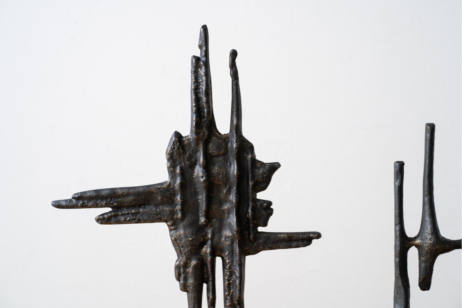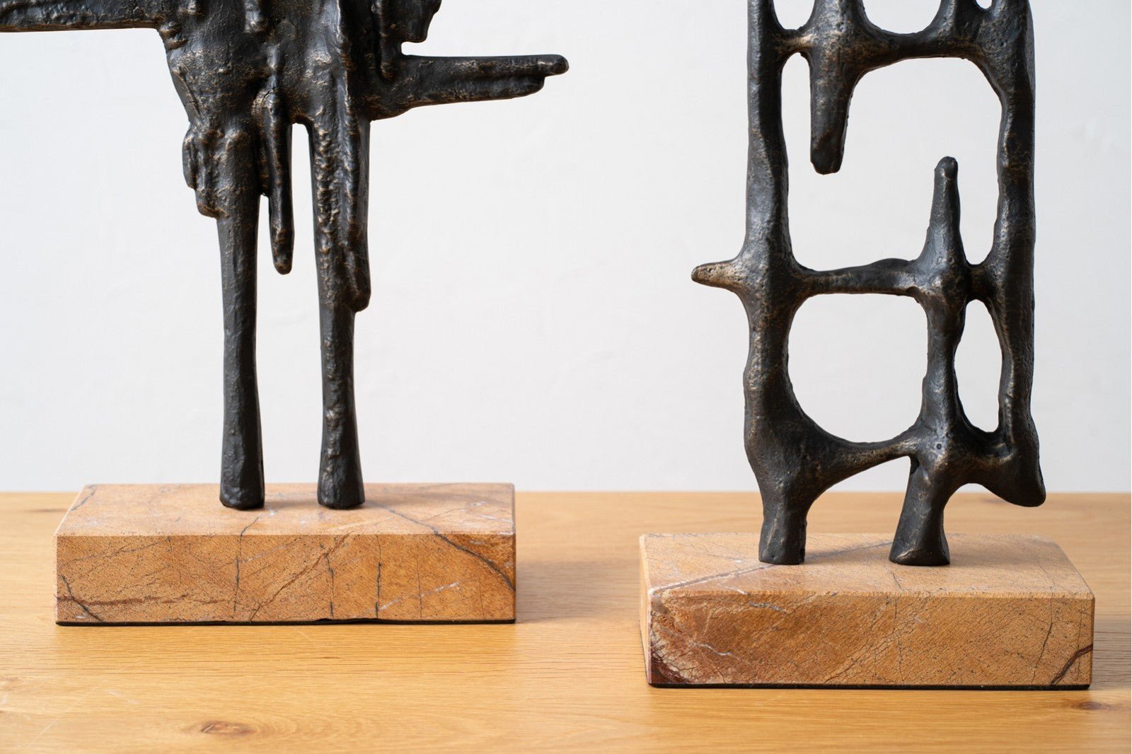 Escultura abstracta realizada en metal acabado en color bronce envejecido y base de mármol en tonalidades cálidas marrones, beige y granates. Disponible dos formas y medidas diferentes