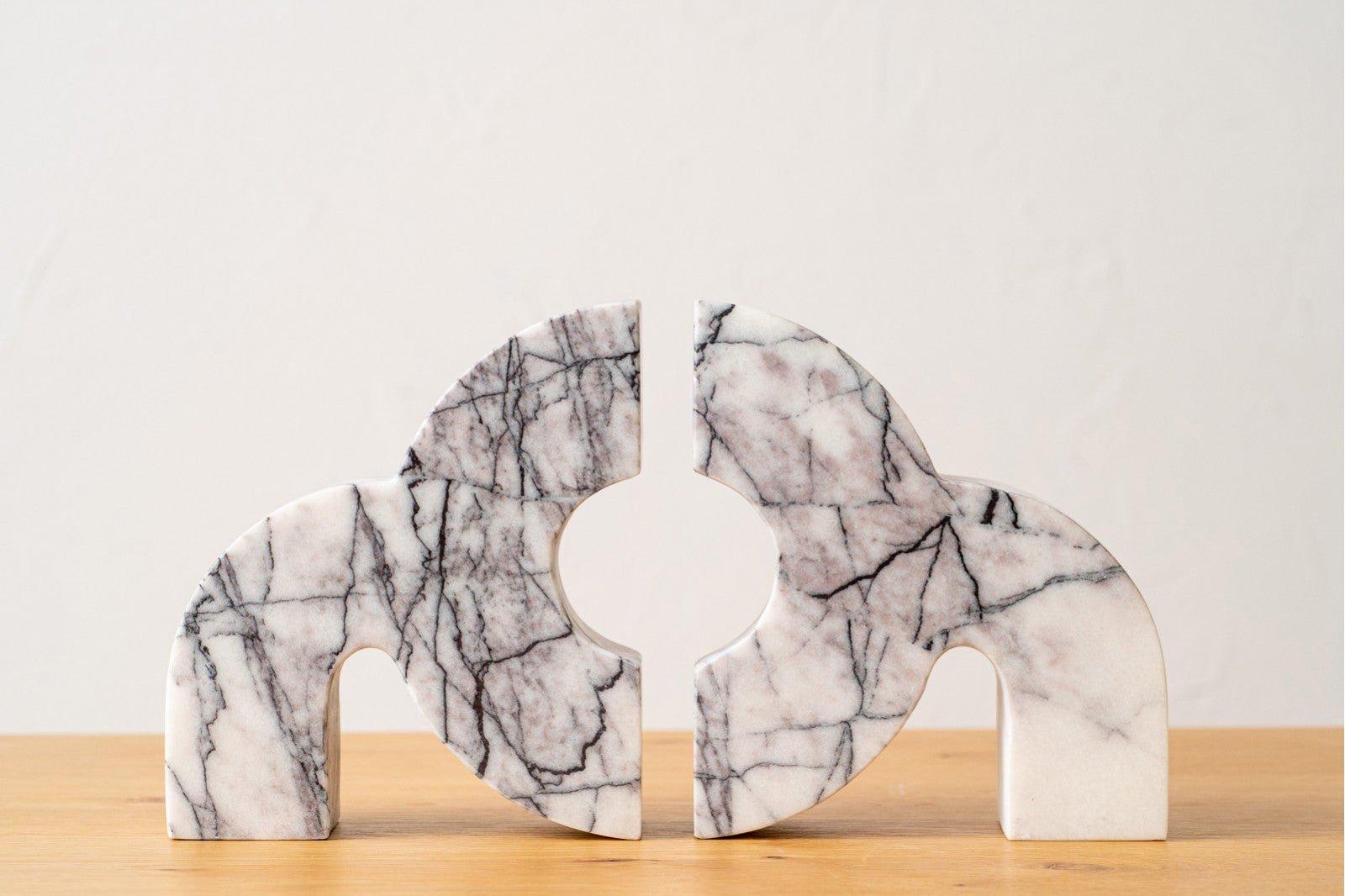 Escultura realizada en mármol de tonalidad blanca con vetas en grises, formada por dos piezas independientes y simétricas, esta escultura se convierte en una sola pieza decorativa en la que destacan sus líneas curvas y semicírculos.