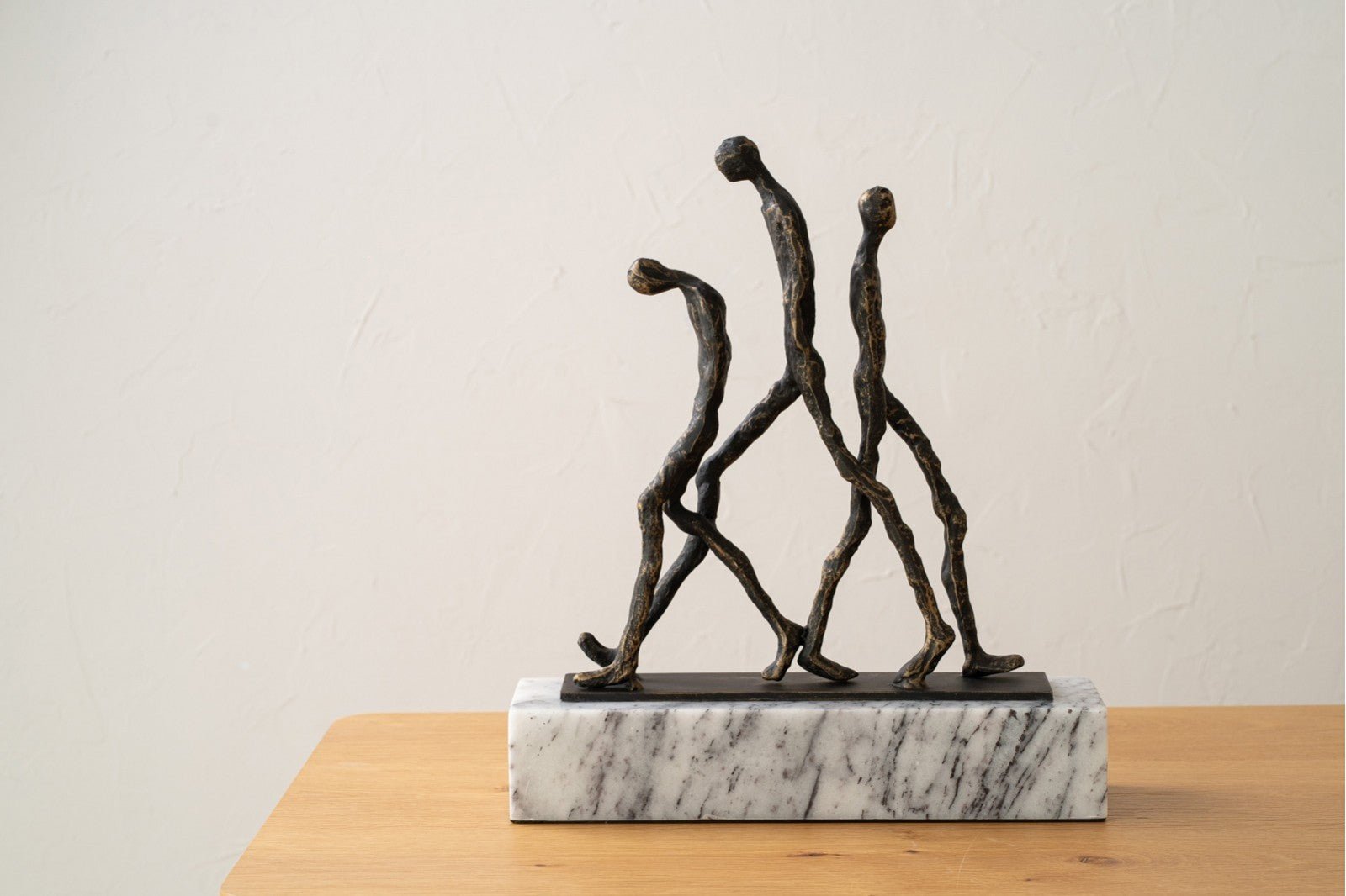 Escultura realizada en metal acabado bronce envejecido sobre base de mármol blanco con vetas en gris.