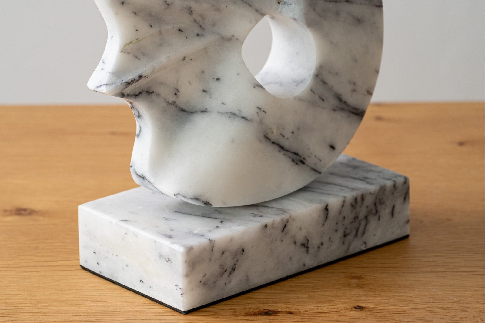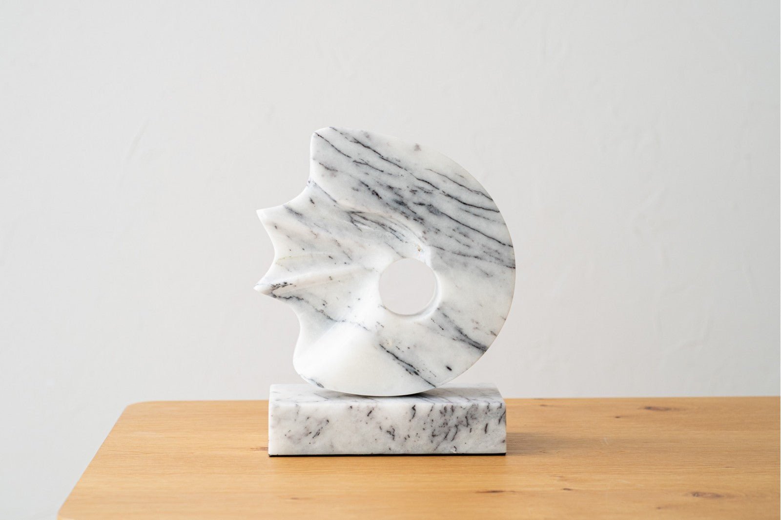 Escultura realizada en mármol color blanco con vetas en gris y negro de formas curvas y con volumen que recuerda el movimiento de especies marinas.