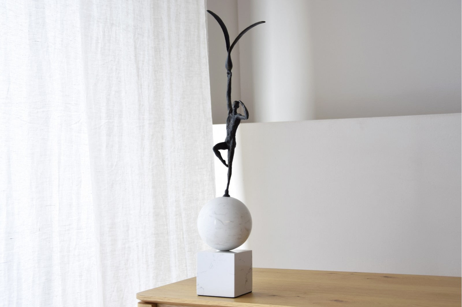 Escultura realizada en metal acabado en bronce envejecido sobre base de mármol blanco con veta gris, se trata de una figura humana en equilibrio sobre una esfera de mármol que sostienen con el brazo alzado un pájaro y todas estas piezas sobre un cubo también de mármol, al tratarse de piedras naturales y acabados artesanales puede haber variaciones de unas piezas a otras.