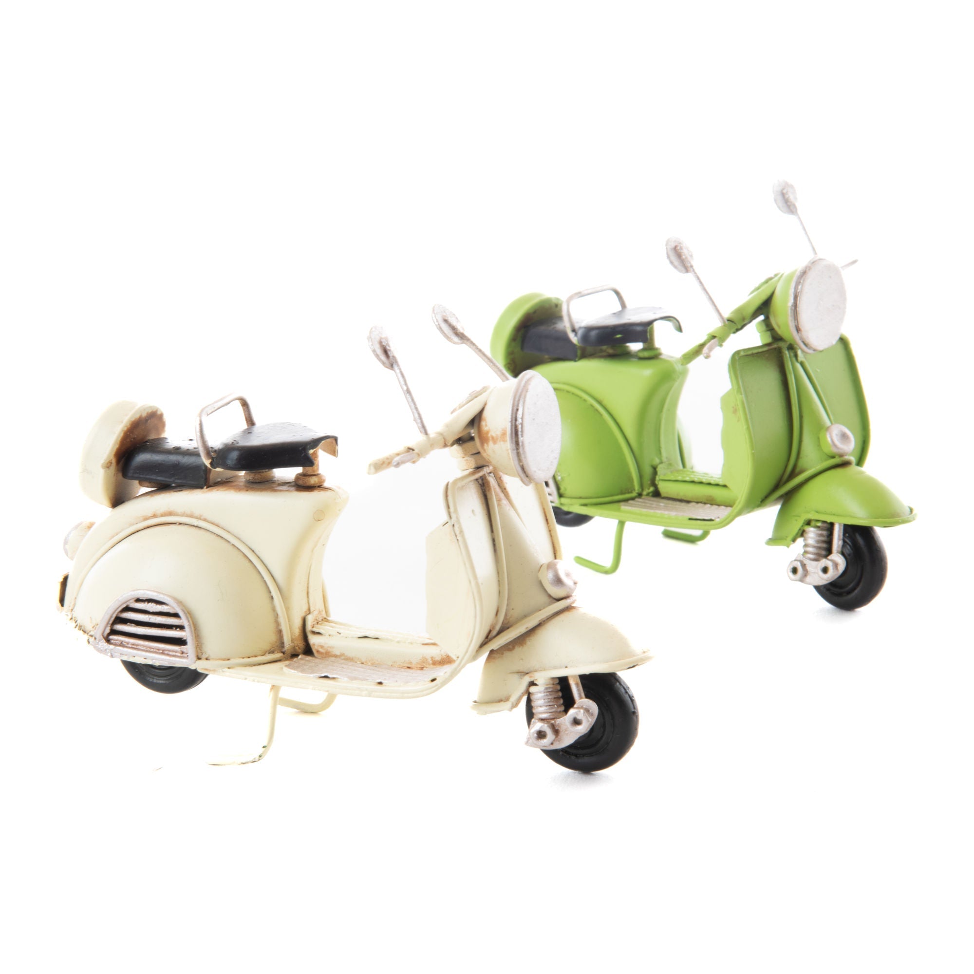 Preciosa figura decorativa en forma de moto Vespa fabricada en metal y plástico con colores blanco y verde.