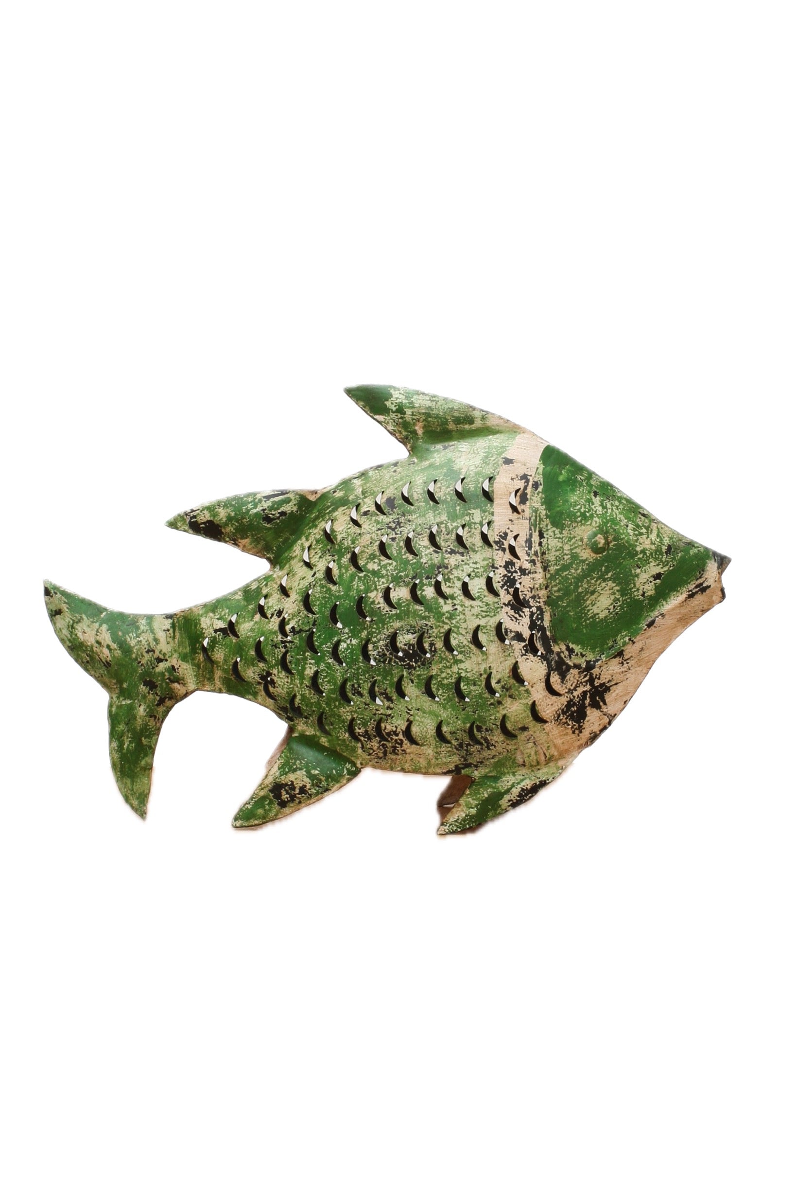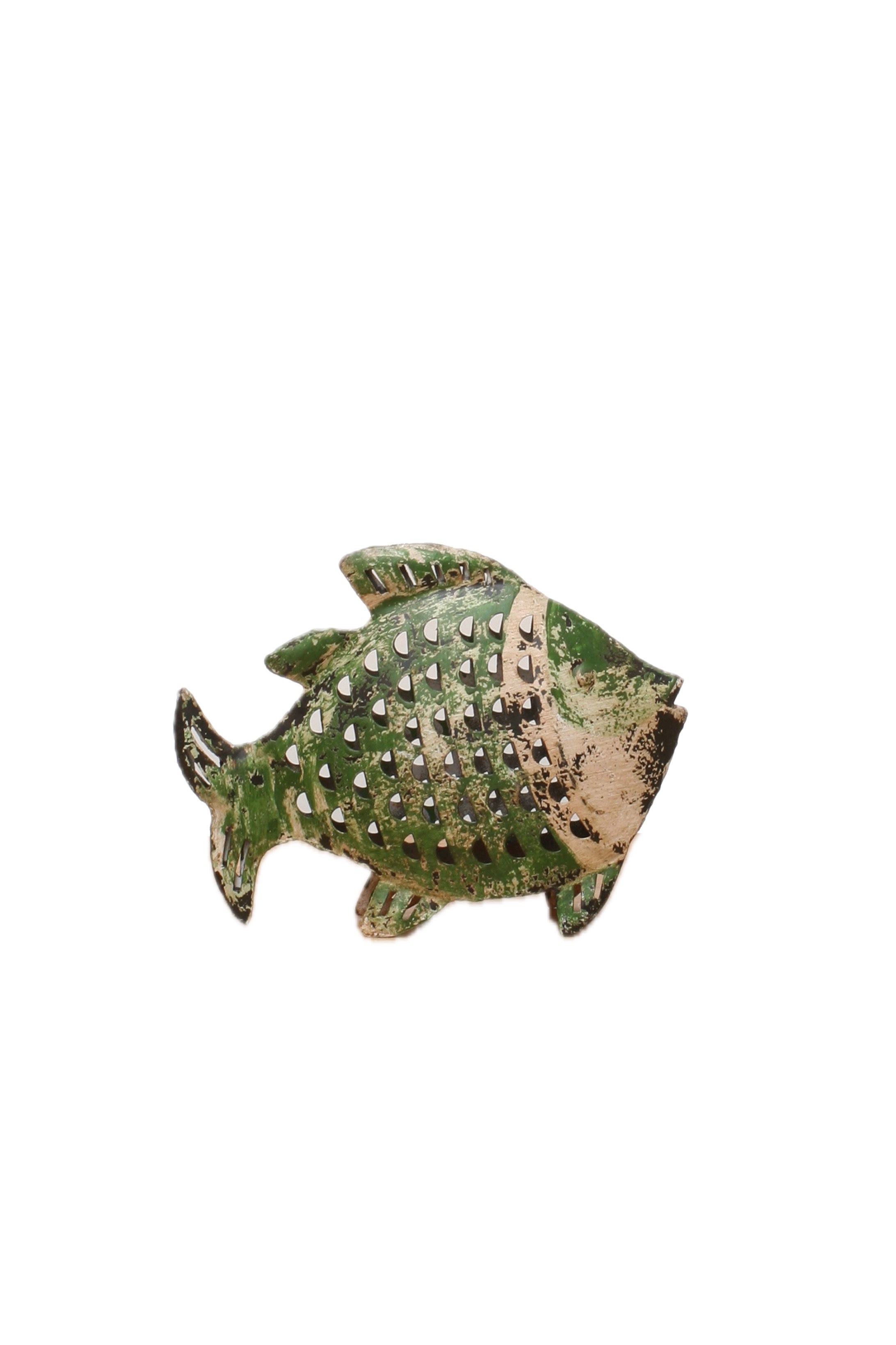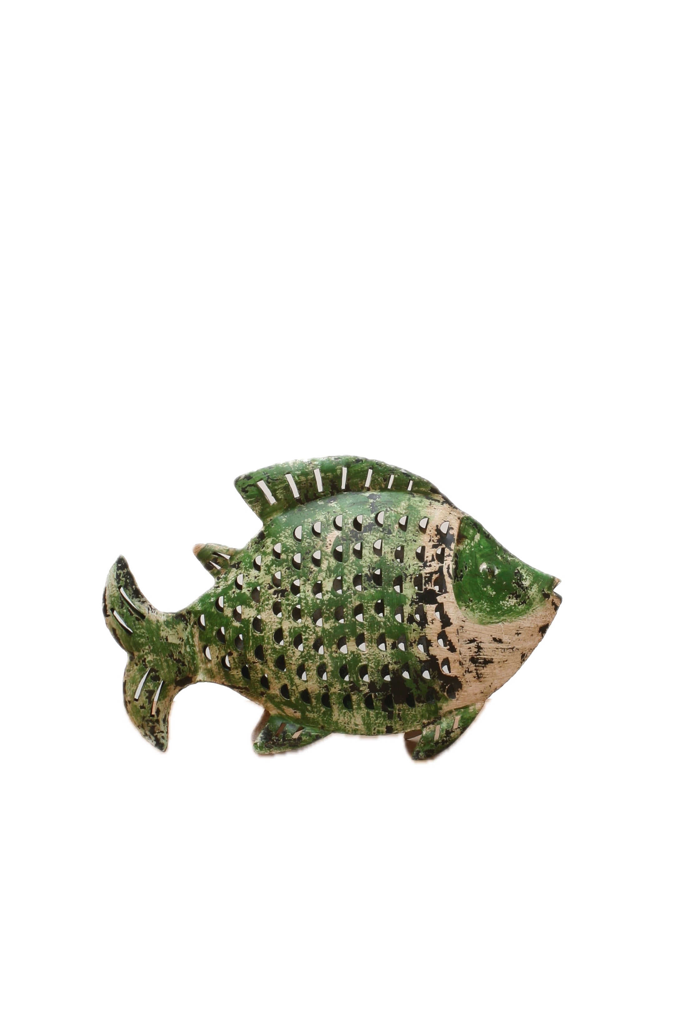 Pez decorativo fabricado en hierro de color verde y beige, con un acabado artesanal que puede mostrar ligeras zonas de desgaste u óxido superficial propios del material. Cada pieza es única y puede presentar un nivel distinto de envejecido, formando parte natural del estilo de esta colección. Se sostiene sobre sí mismo y está disponible en varios tamaños.