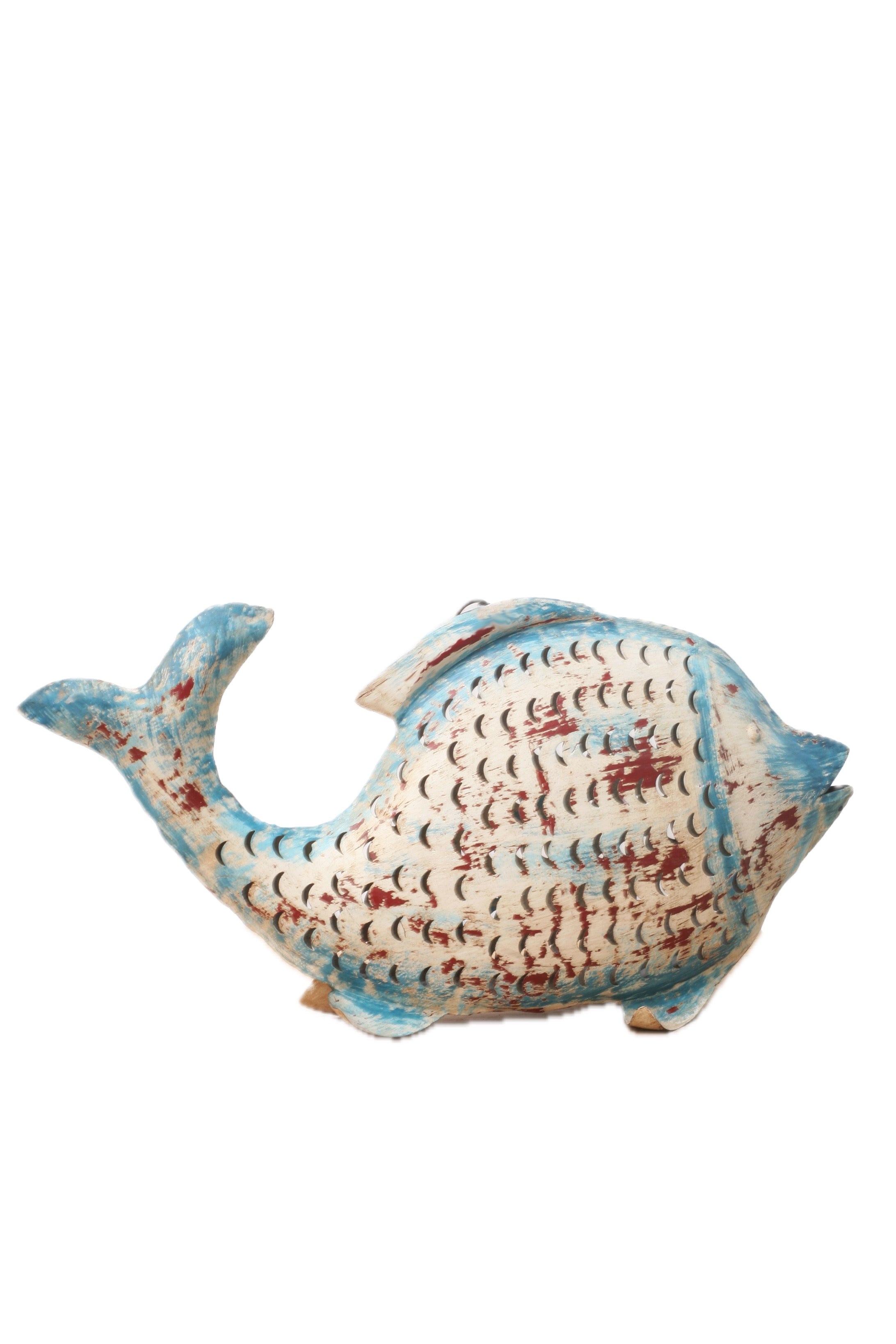 Pez decorativo de hierro con portavela en colores azul y blanco, acompañado de cadena. Presenta un acabado artesanal que puede mostrar pequeñas zonas de desgaste u óxido superficial propios del material. Cada pieza es única y puede tener un nivel distinto de envejecido, formando parte natural del estilo de esta colección. Se sostiene sobre sí mismo.