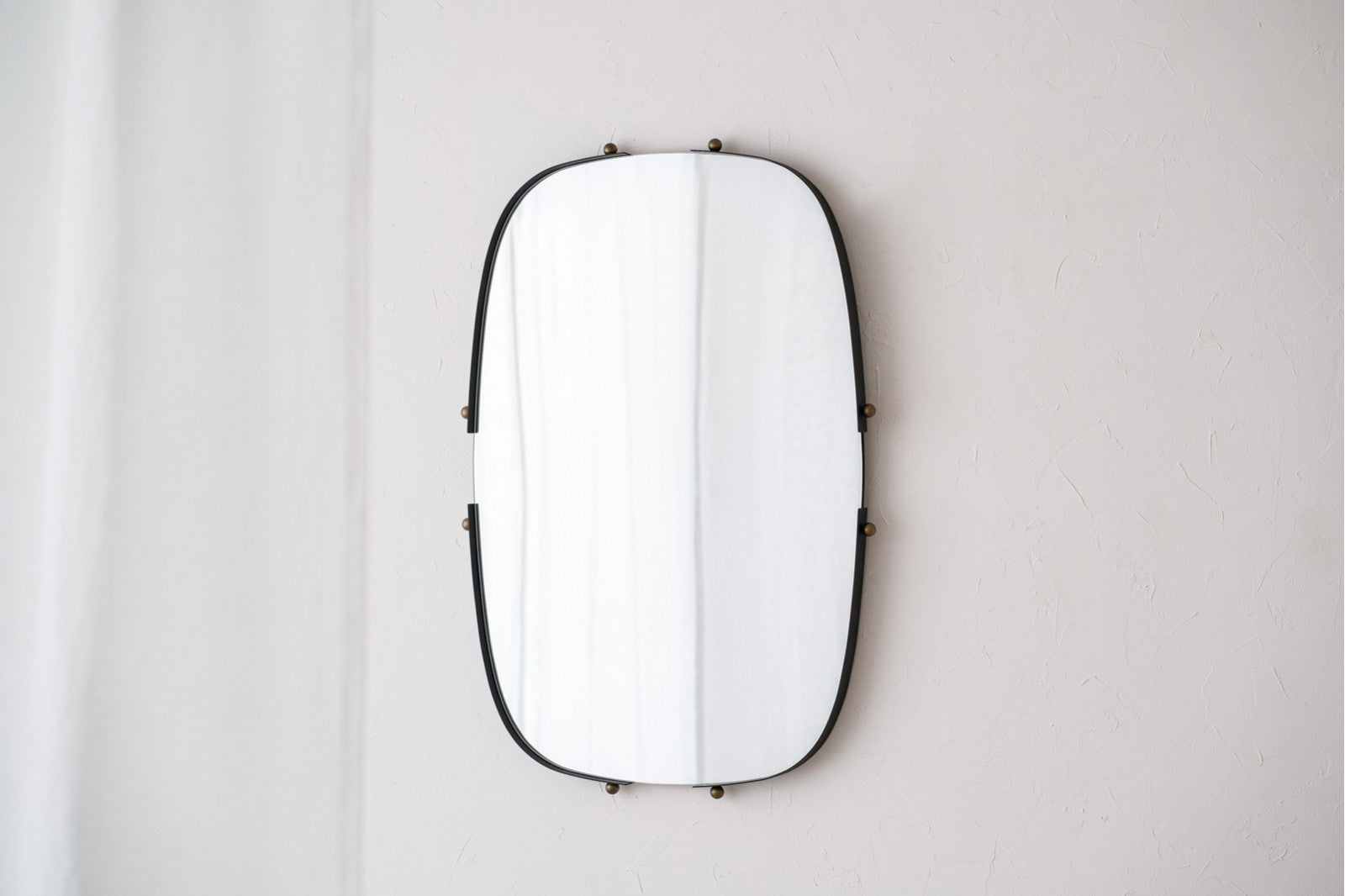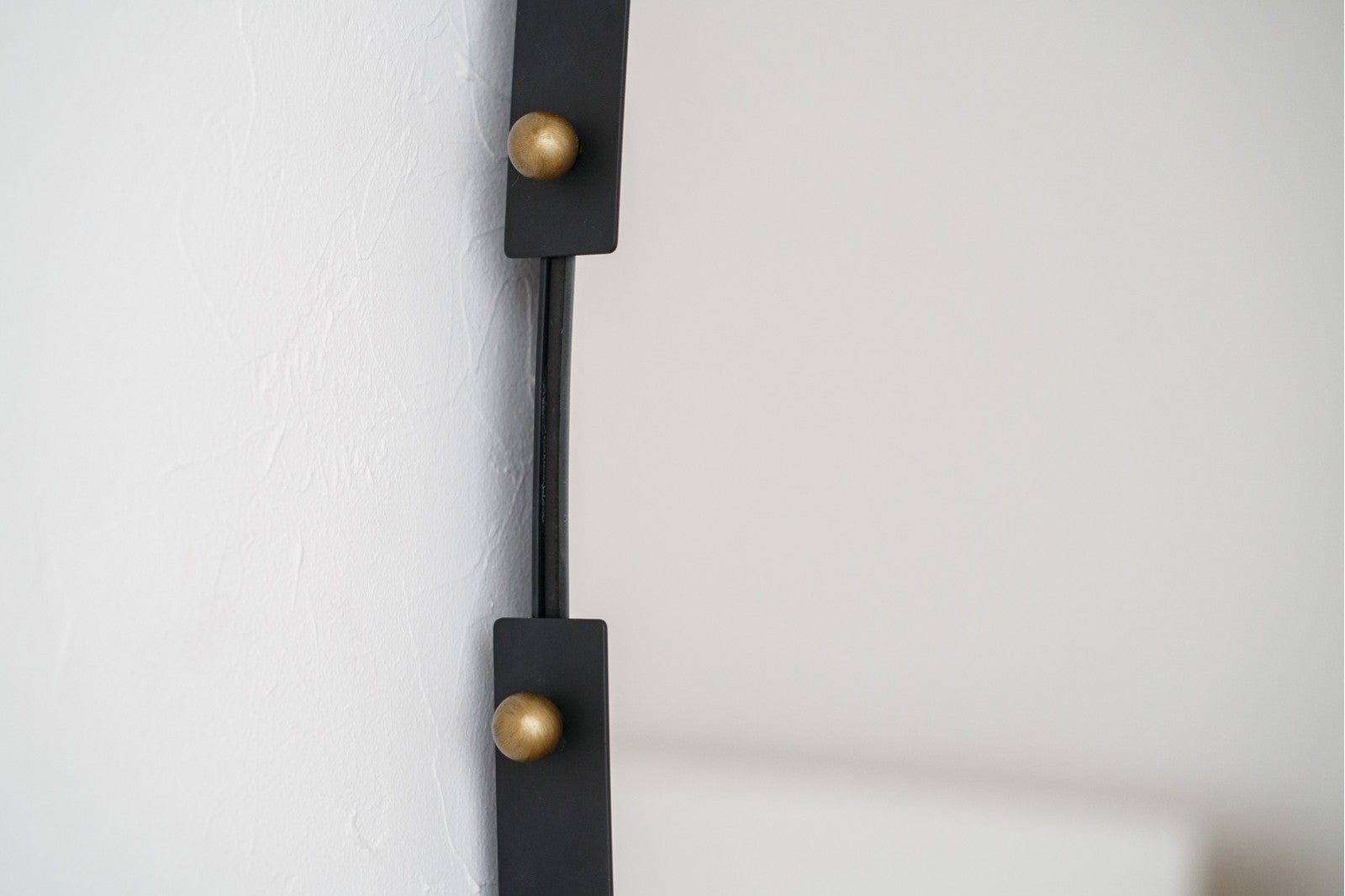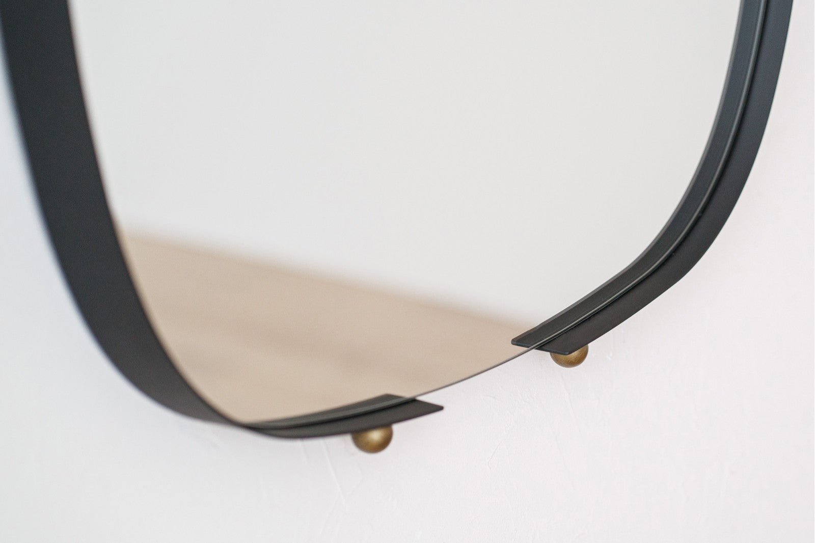 El marco metálico en acabado negro incorpora espacios simétricos en los centros de los lados, acentuados con detalles esféricos en oro envejecido, que generan un contraste visual sofisticado. El espejo se sitúa detrás del marco, otorgándole profundidad y realce, transformando la pieza en un elemento decorativo con carácter y presencia.
