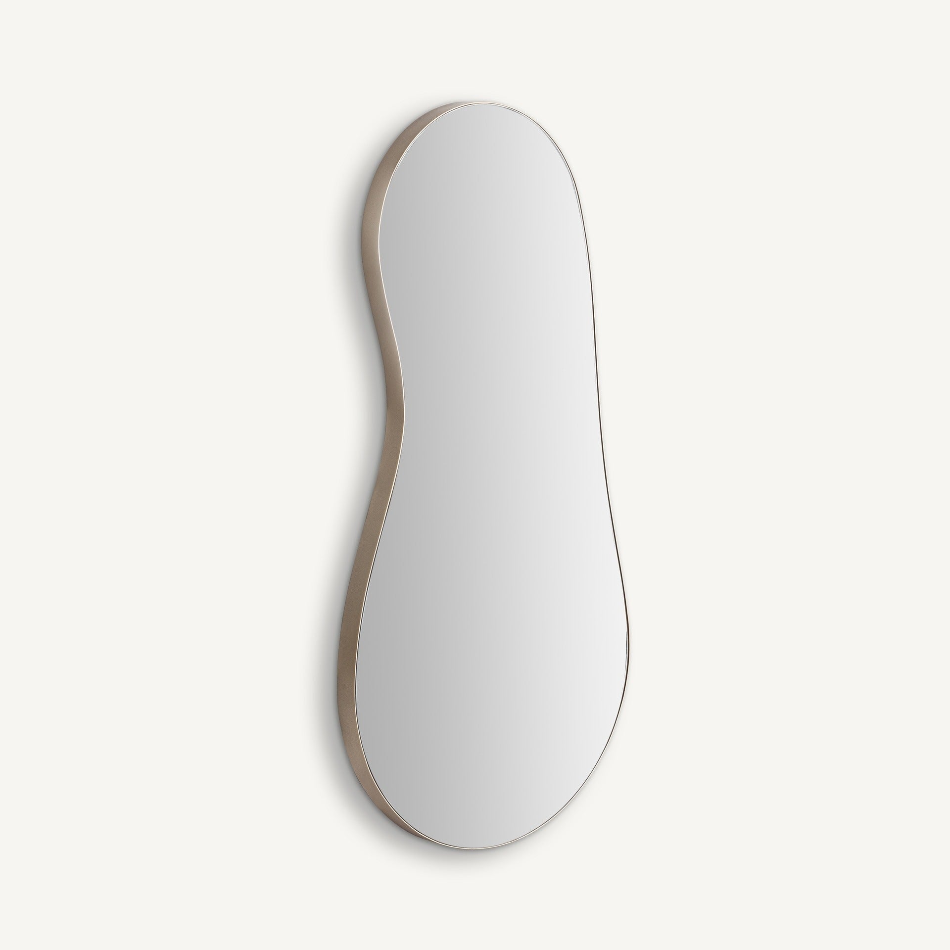 El marco metálico, delicado pero firme, dibuja una silueta estilizada que enmarca un espejo nítido y luminoso, creando un equilibrio perfecto entre funcionalidad y estilo. El contraste entre el dorado cálido y el reflejo del vidrio potencia la sensación de amplitud y luminosidad, convirtiéndolo en un protagonista ideal para salones, recibidores, dormitorios o pasillos.