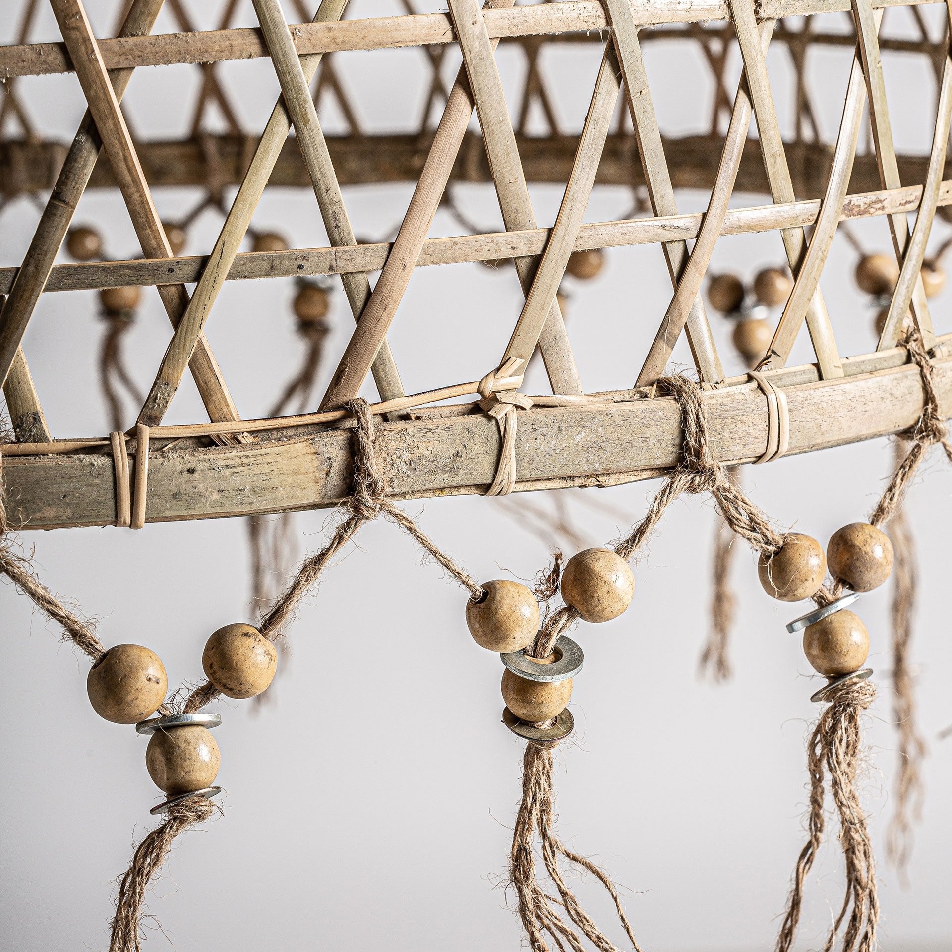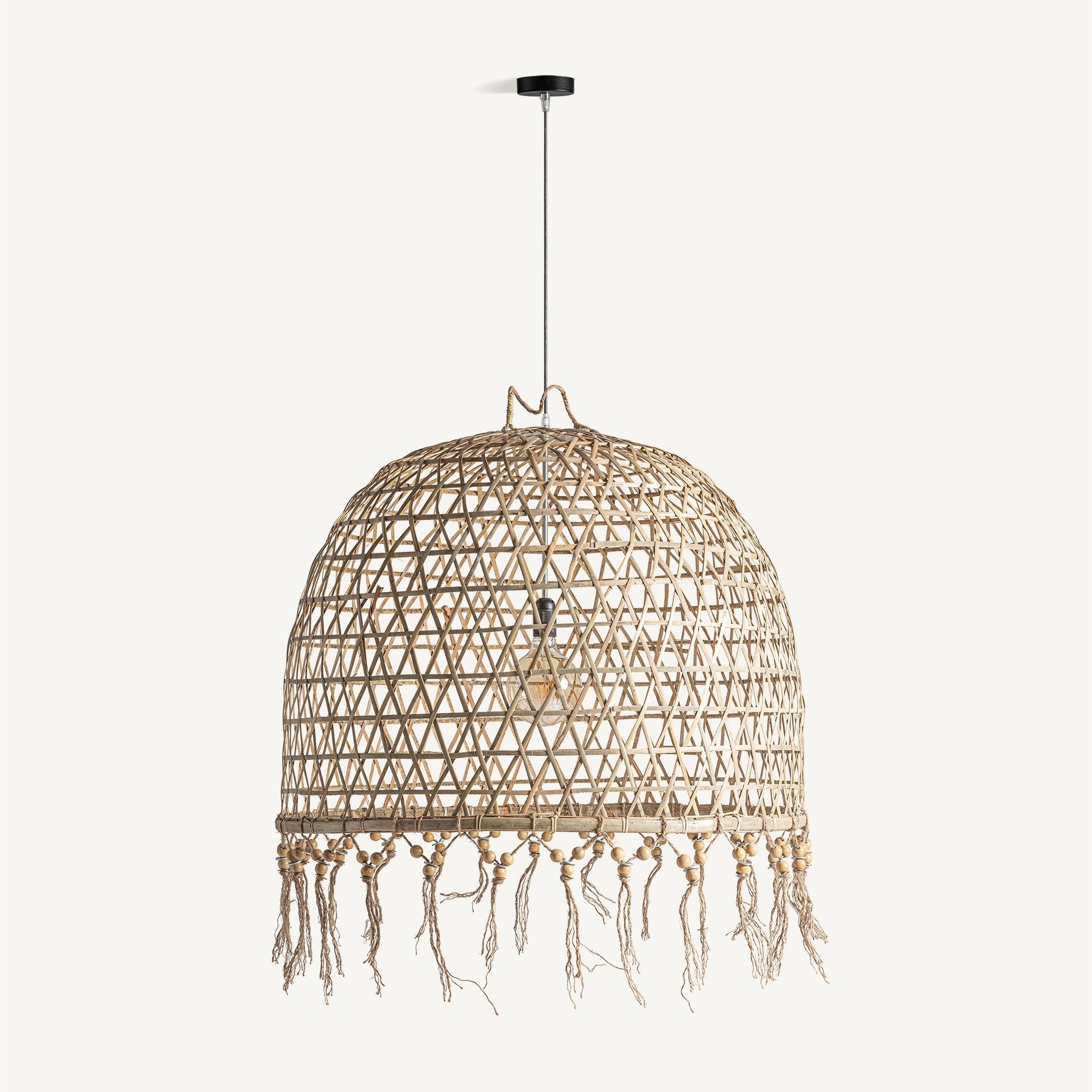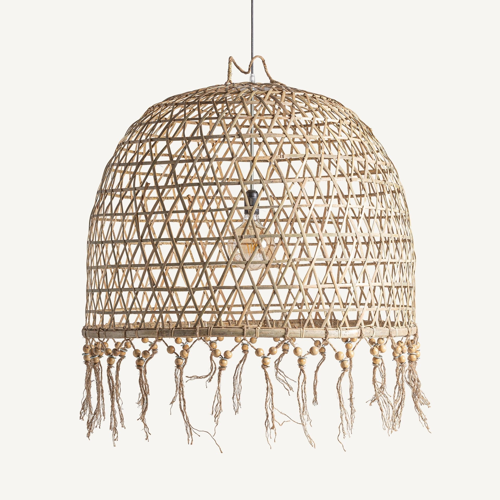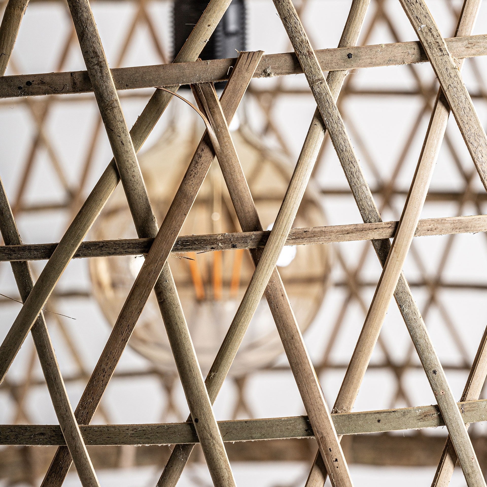 El cuerpo principal está fabricado en bambú natural trenzado a mano, con un delicado acabado en tono marrón cálido que evoca la tierra, la naturaleza y el estilo de vida slow. Su diseño abierto permite que la luz se filtre suavemente a través de las fibras, proyectando sombras orgánicas y generando una atmósfera envolvente y acogedora.