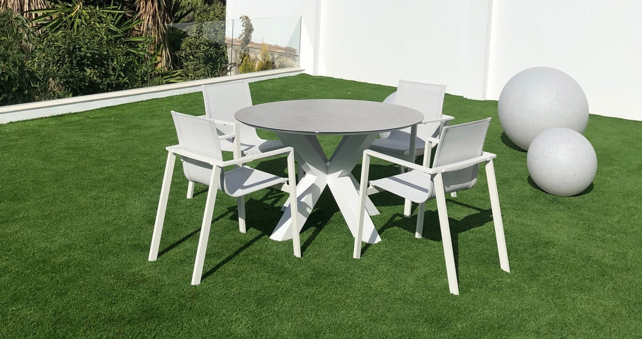 Silla de exterior apilable fabricada en aluminio y textilene en color blanco.
