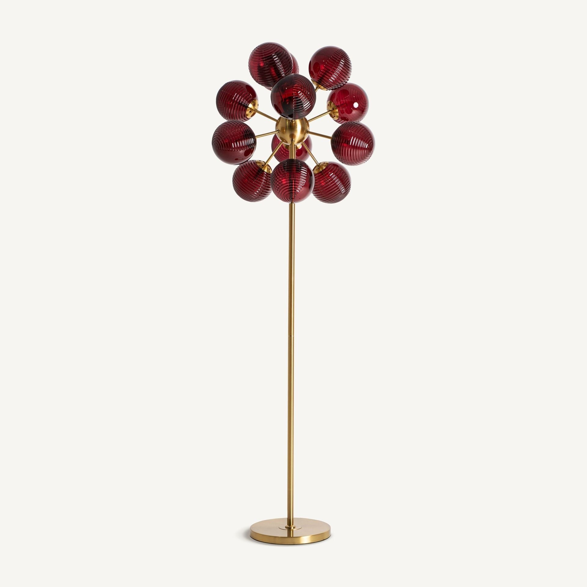 La lámpara de pie Cerezo es mucho más que una fuente de luz: una obra de arte con alma escultórica que transforma cualquier ambiente en un espacio de sofisticación y estilo. Su diseño combina racimos de cristal en tono burdeos, delicadamente dispuestos, que reflejan la luz con un brillo cálido y cautivador, evocando la belleza natural de un cerezo en flor.