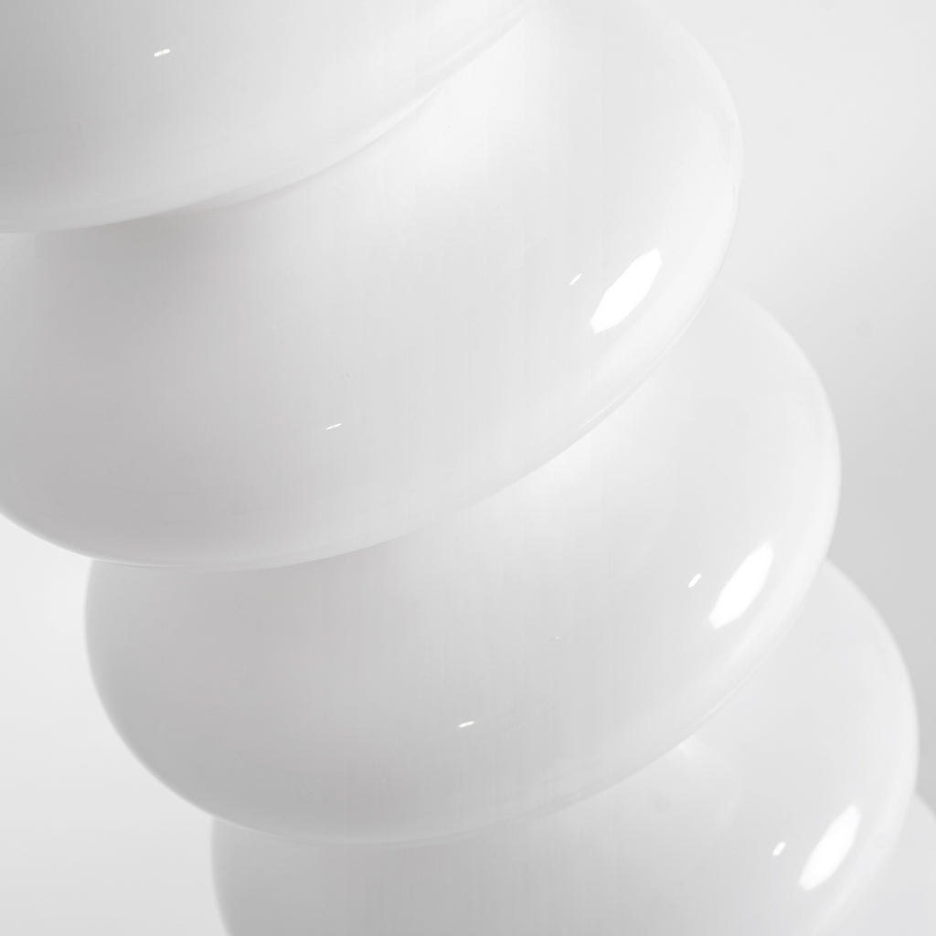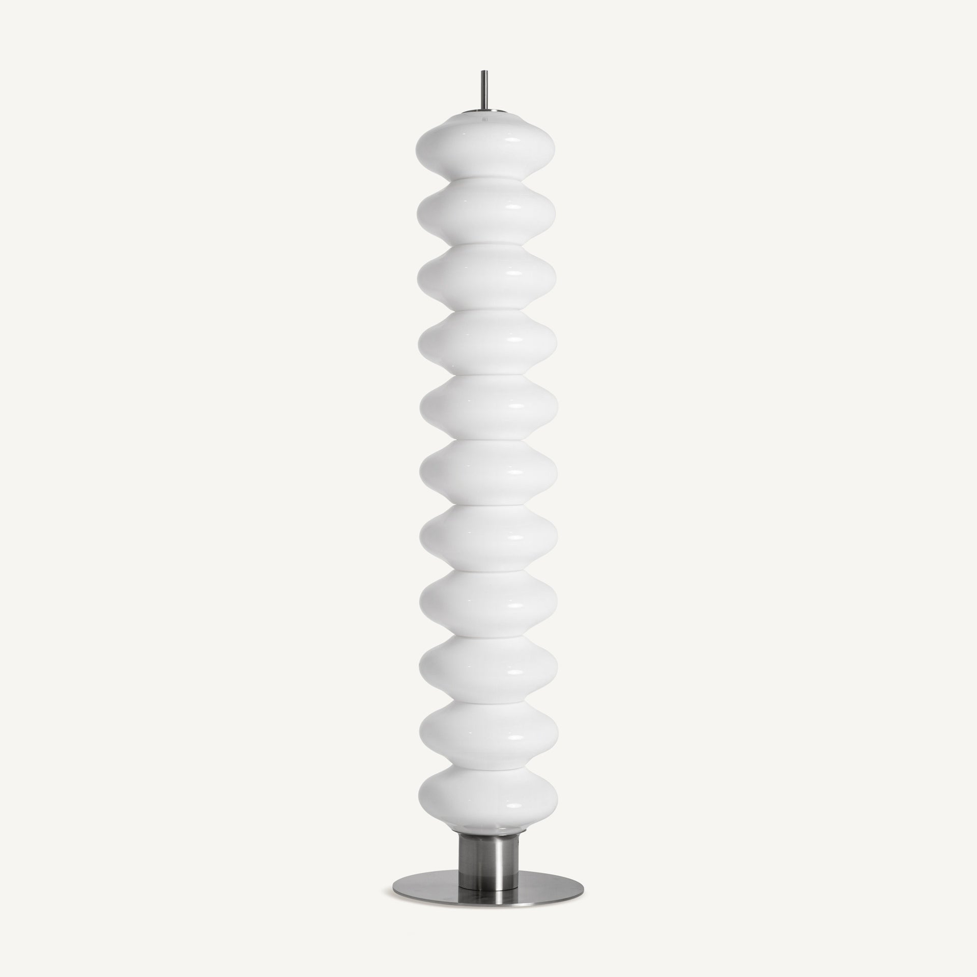 La lámpara de pie Kandy redefine el concepto de iluminación decorativa al presentarse como una auténtica escultura de luz. Su estructura de cristal blanco ondulado crea un juego de texturas y reflejos que aporta movimiento y un atractivo visual inmediato. Esta pieza se eleva sobre una base metálica de líneas limpias que refuerza su estética contemporánea y su presencia elegante.