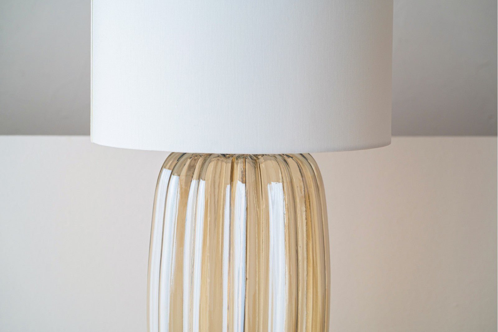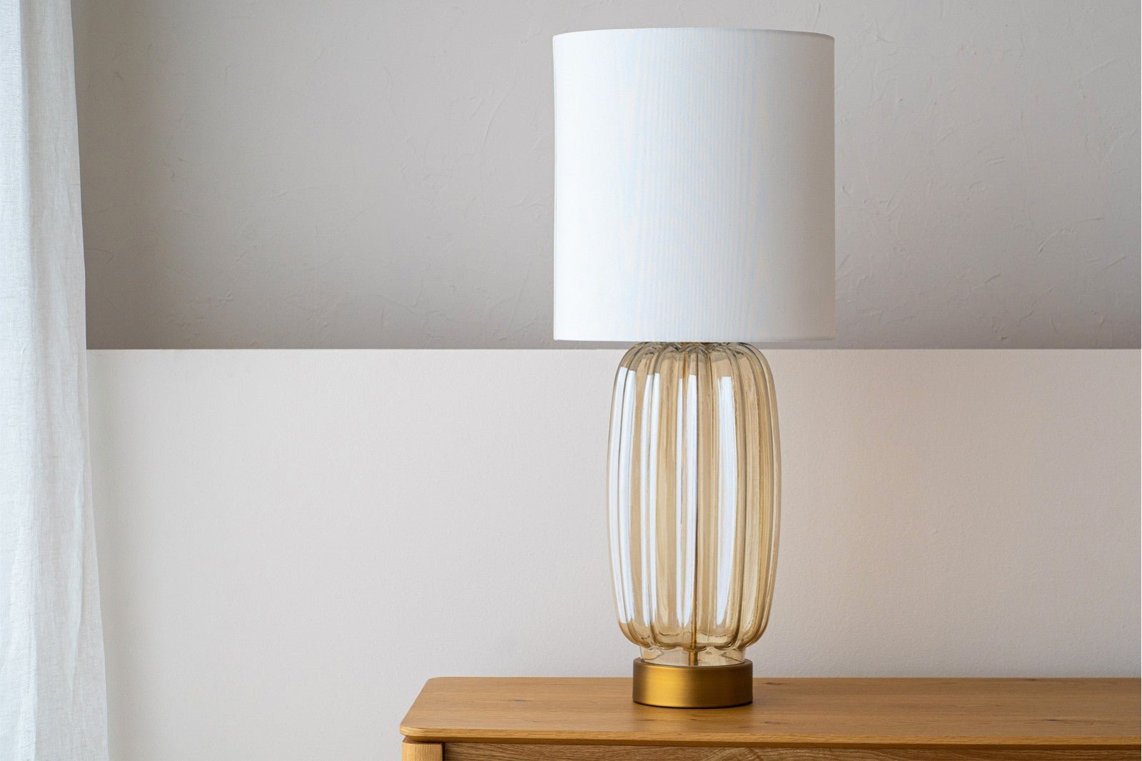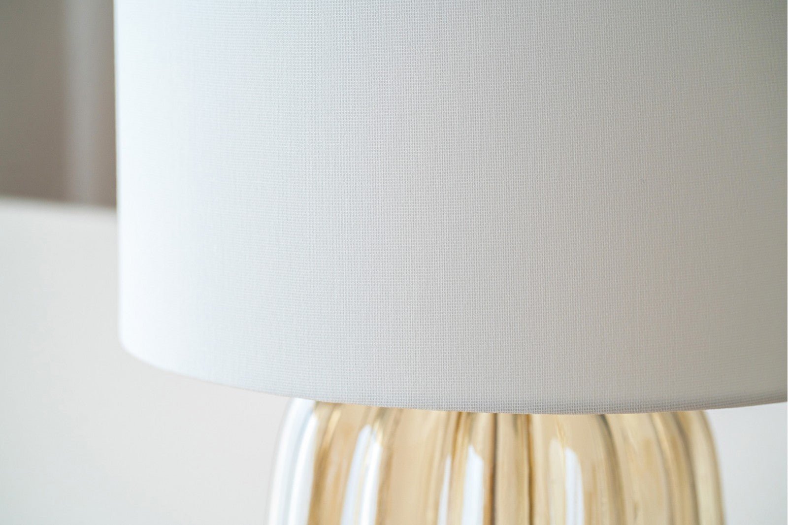 Incluye una pantalla cilíndrica en lino blanco, que suaviza la luz y realza el contraste con la base, creando un ambiente acogedor y armonioso. Su estilo combina funcionalidad y estética, convirtiéndola en un elemento decorativo ideal para salones, dormitorios u oficinas modernas.