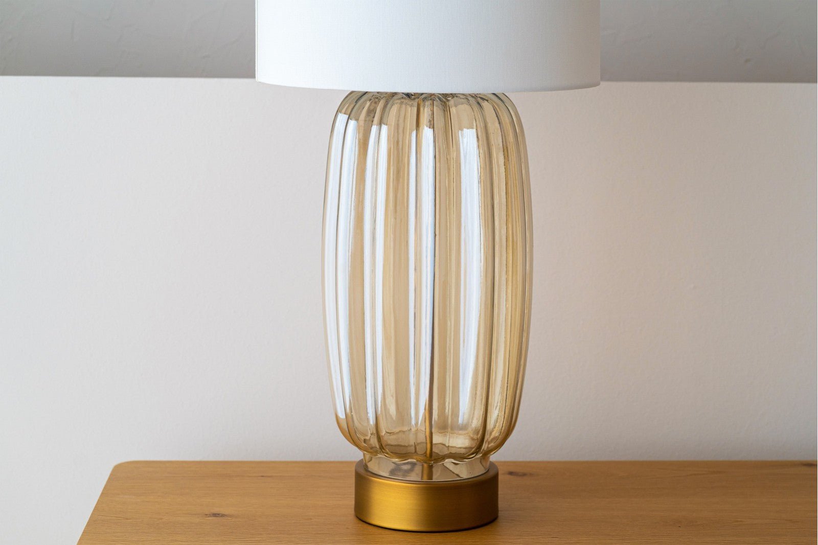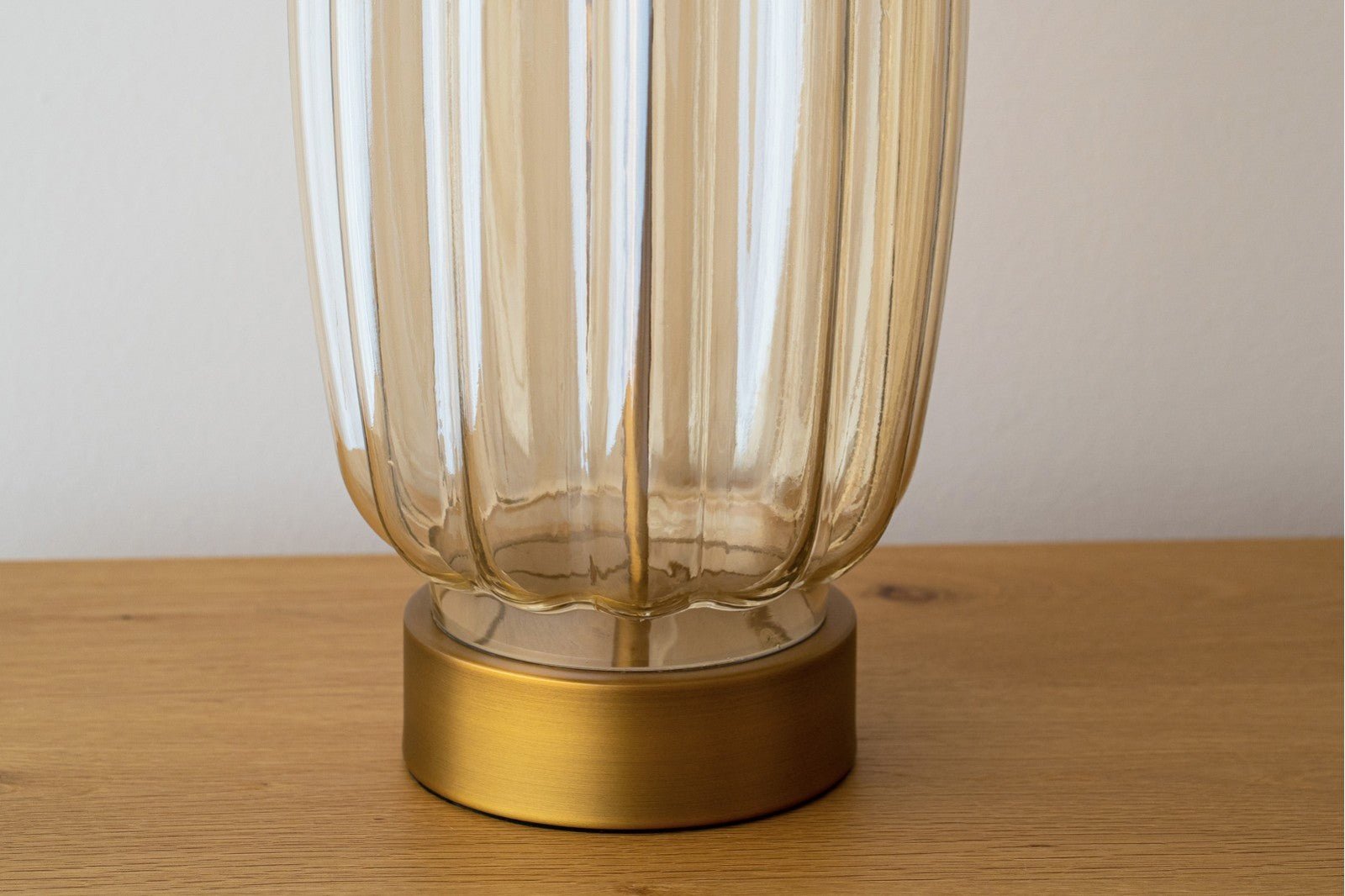 La lámpara de mesa Aire destaca por su diseño elegante y contemporáneo, combinando vidrio en tono ámbar transparente con una base de metal en acabado oro envejecido mate, que aporta un toque sofisticado y cálido a cualquier espacio.