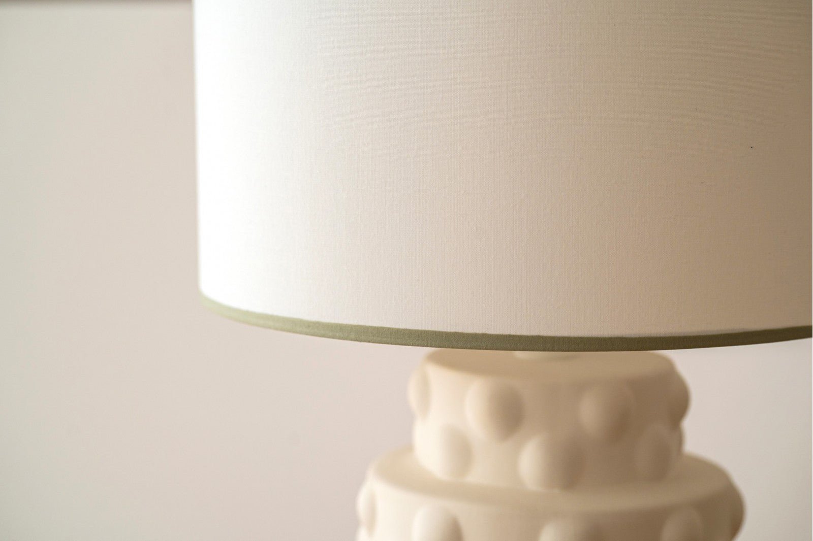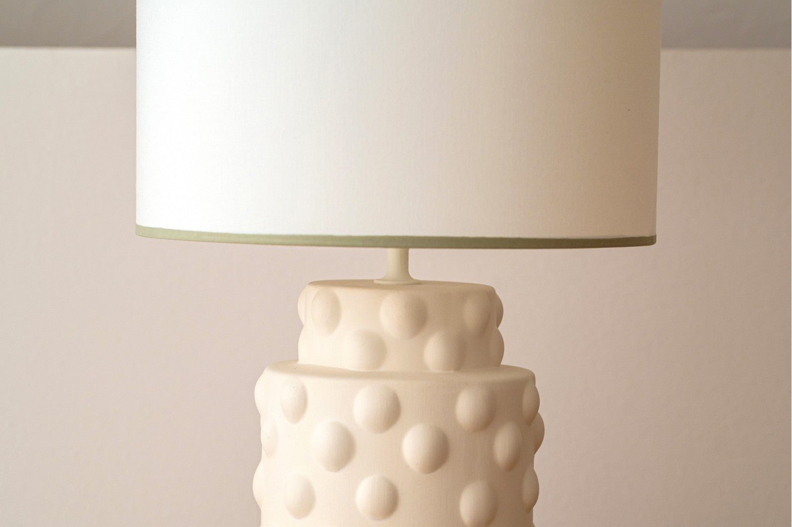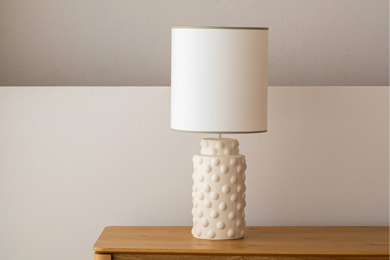La lámpara Laeno es una pieza decorativa de mesa elaborada en cerámica, con un diseño cilíndrico vertical que aporta presencia y elegancia a cualquier espacio. Su superficie está adornada con un patrón uniforme de relieves circulares en forma de pequeñas semiesferas distribuidas de manera regular, creando textura y dinamismo visual.