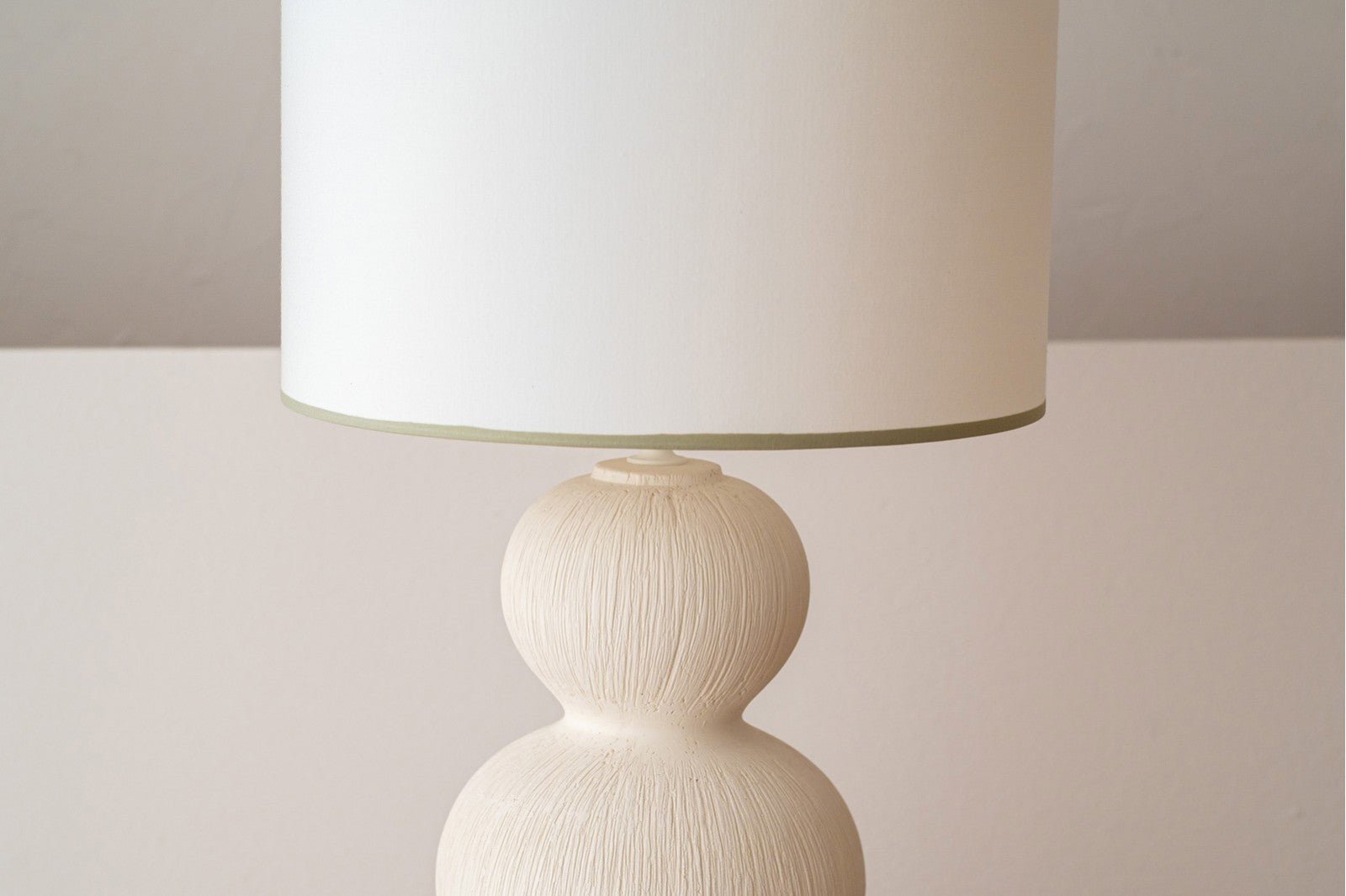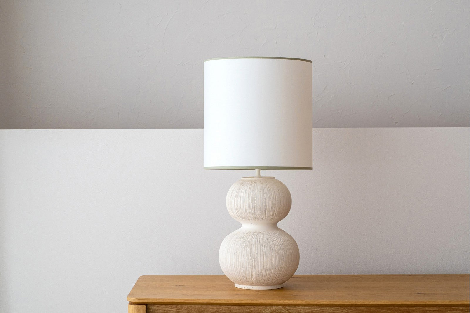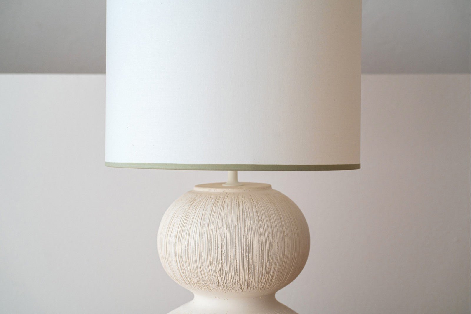 La pantalla de algodón blanco roto, rematada con vivos en tono verde suave en la parte superior e inferior, completa la pieza con un contraste sutil y elegante, convirtiéndola en un punto focal decorativo ideal para espacios contemporáneos o minimalistas.
